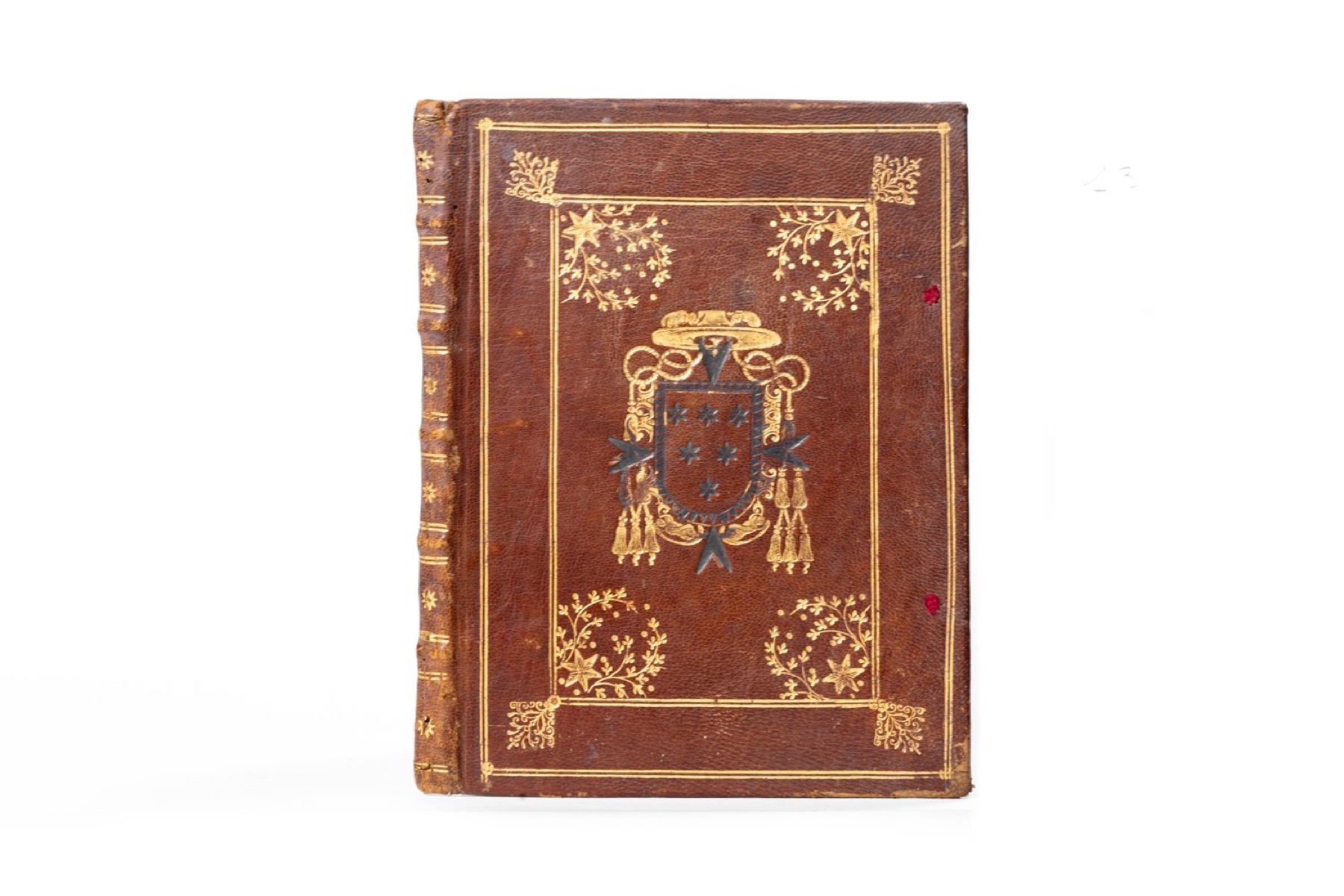Elegante legatura vuota in marocchino marrone del sec. XVIII, decorazione impressa in oro, piatti inquadrati da doppia cornice di filetto, agli angoli esterni piccoli festoni, ed agli interni ghirlanda di fiori con stella, al centro del campo le armi del cardinale Altieri sormontate da cappello prelatizio e da tre ordini di fiocchi, ai comparti del dorso ferri a forma di stella, tracce di nastri di chiusura, leggere abrasioni.