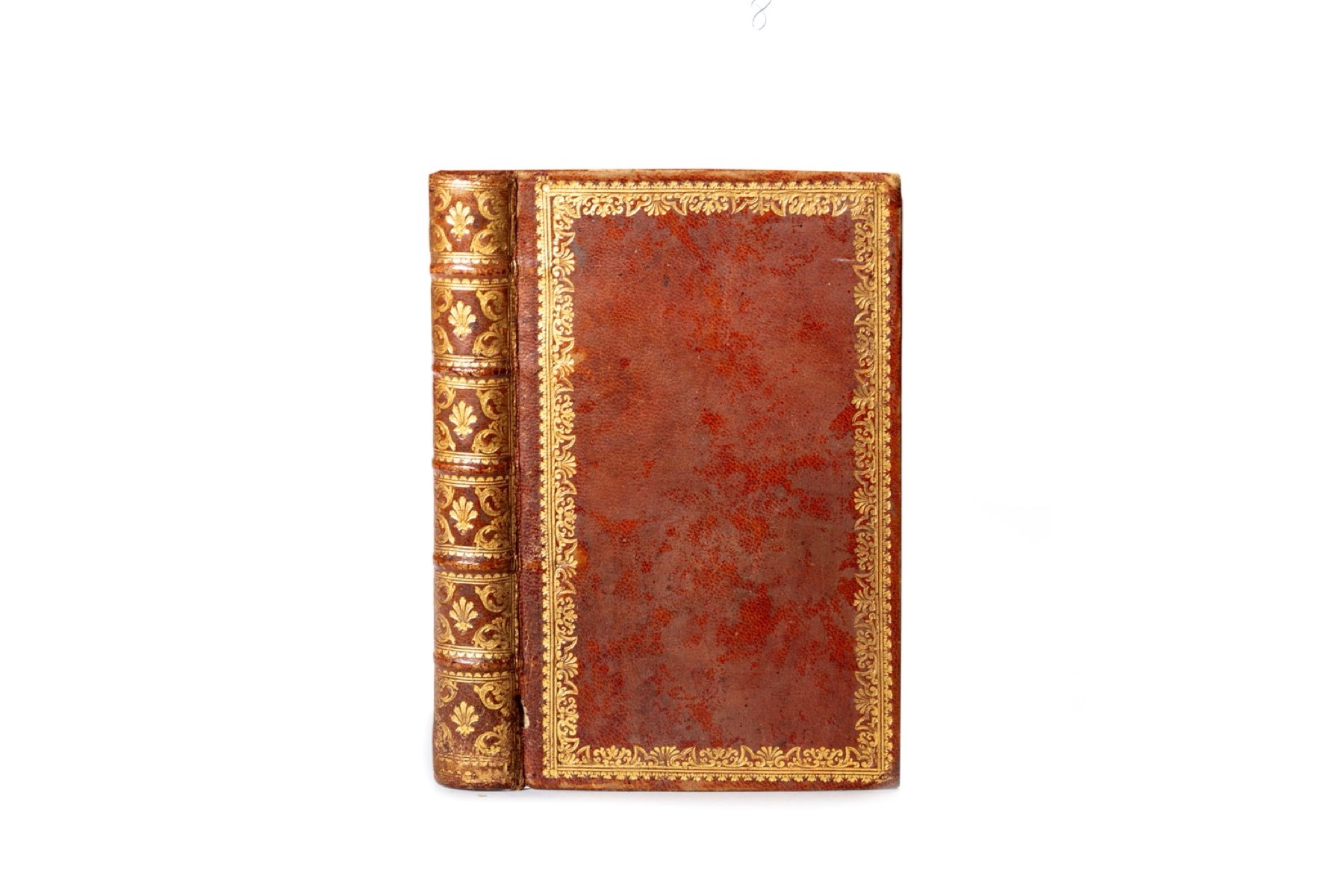 Roma, G. Mainardi, 1733. In 8°. Elegante antiporta architettonica figurata, frontespizio e testo in rosso e nero, 3 tavole a piena pagina finemente incise in rame, legatura romana in marocchino rosso, ai piatti cornice di motivi stilizzati impressi in oro, dorso a 5 comparti con fregi in oro, tagli dorati, abrasioni e fori di tarlo.