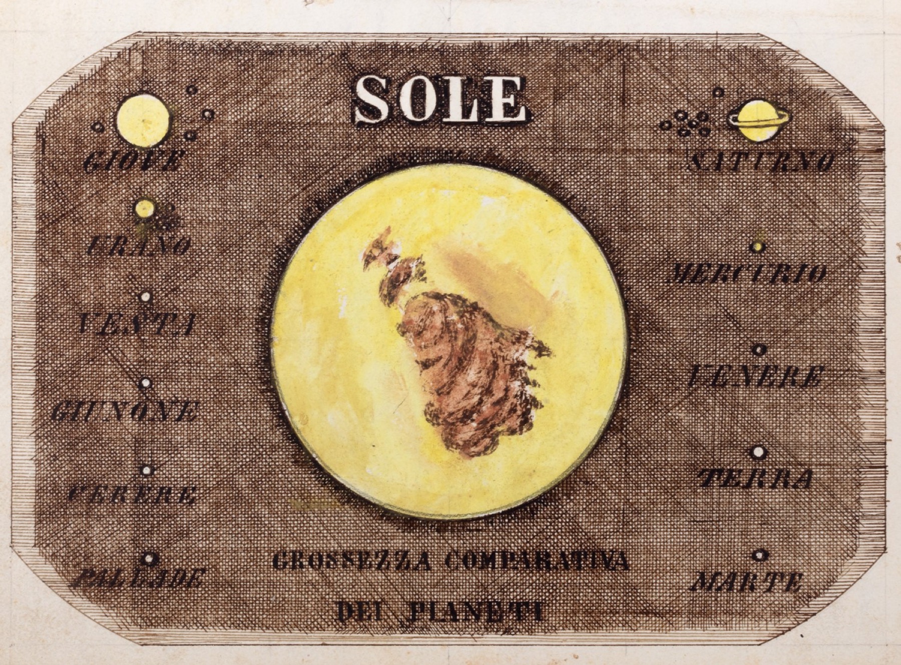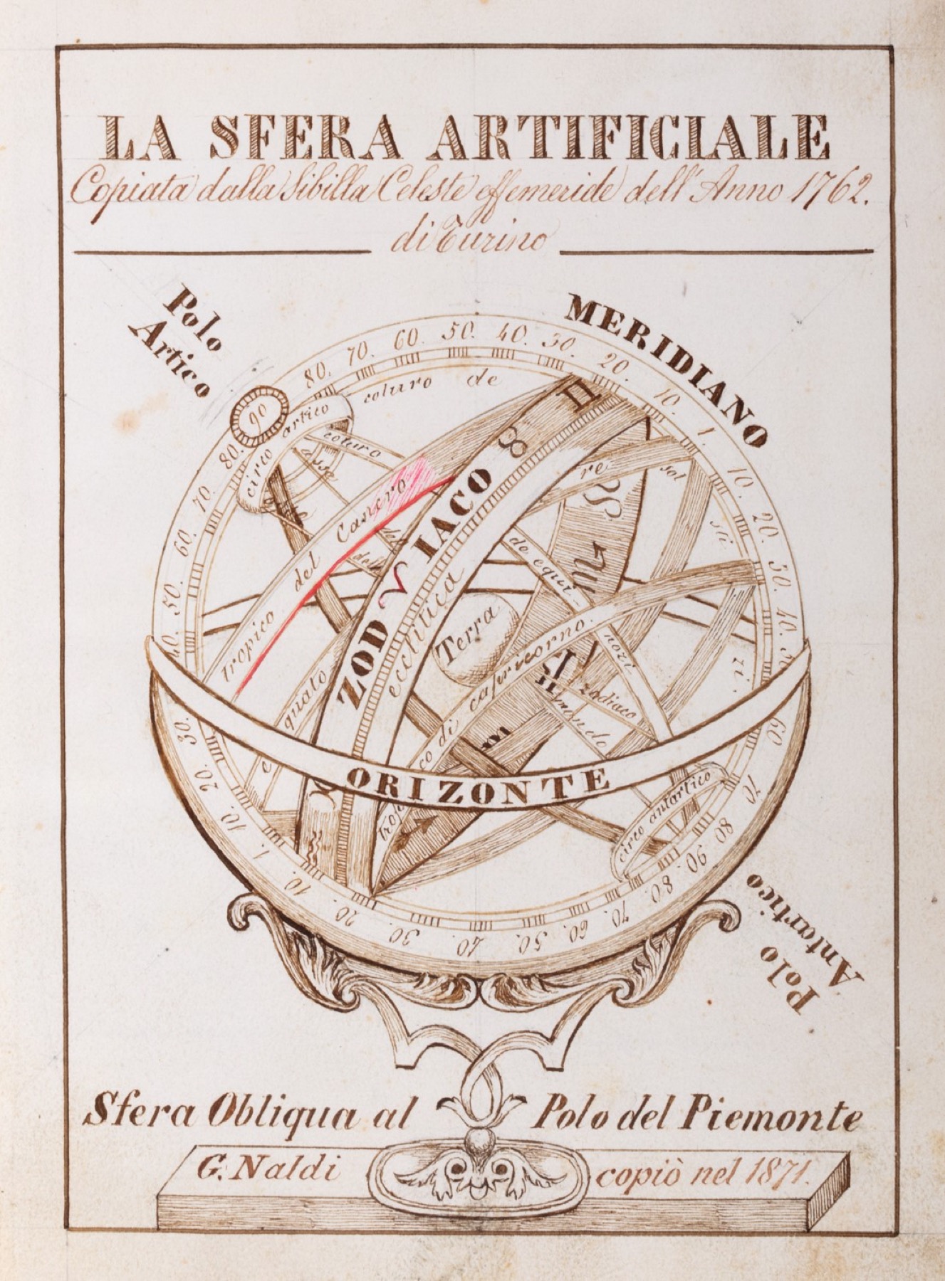 Manoscritto cartaceo esemplato da G.Naldi nel 1871 sul modello della "Sibilla Celeste effemeride dell'Anno 1762 di Turino" e su altri testi di astronomia, 271 pp. numerate, elegante frontespizio raffigurante una sfera armillare, calcoli, schemi, disegni, tabelle, diagrammi etc., alcuni elegantemente disegnati e colorati, legatura coeva in mezza pergamena e cartone maculato marrone.