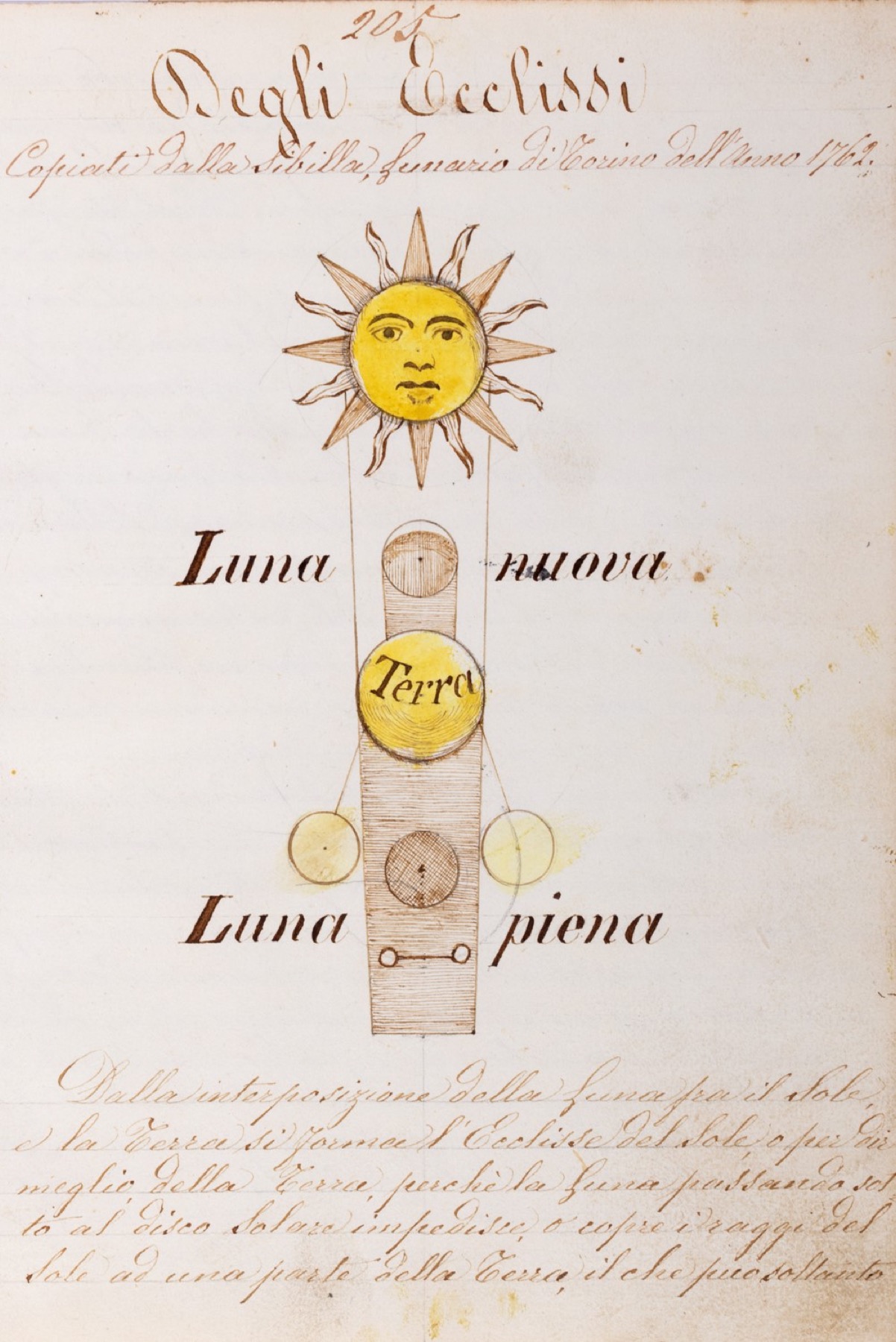 Intrigante manoscritto astronomico dall'apparente aspetto compilativo, come dichiarato al frontespizio, in realtà frutto di una ragionata selezione di testi , trattati, e regole di Astronomia da diverse fonti, opera di tal Gaetano Naldi "per divertimento, overo per non stare in ozio, copiati per mio uso nell'Anno 1870 e 1871." Le quattro pagine iniziali di Indice perimetrano chiaramente il campo di interesse del Naldi, questi i titoli delle varie sezioni: Del Calendario in generale, del calendario Civile, delle Lunazioni, delle Stazioni, delle Eclissi, delle Epoche...del Ciclo Solare, del Numero d'Oro, delle Feste Mobili etc. In 104 capitoli si distribuisce l'interessante silloge raccolta dal Naldi, , diligentemente espressa, delineata e disegnata, ad uso suo personale e per i futuri lettori. Una sorta di breviario astrologico di fine Ottocento, in una fase di incipiente rivoluzione scientifica, che in Torino vedeva una delle indiscusse capitali. La Sibilla Celeste, exemplum menzionato dal Naldi, venne edita a Torino dal 1751 al 1885 e rappresentava uno dei più innovativi testi di divulgazione astronomica dell'epoca. Si trovavano saggi su temi astronomici e geografici divulgati in maniera facile e fruibile anche per un pubblico di non specialisti. Questa fonte di ispirazione si coglie in tutto il manoscritto, ma il Naldi seppe poi compendiare altre suggestioni, di natura diversa, fino a realizzare un completo corso di astronomia aggiornata alla fine dell'Ottocento.