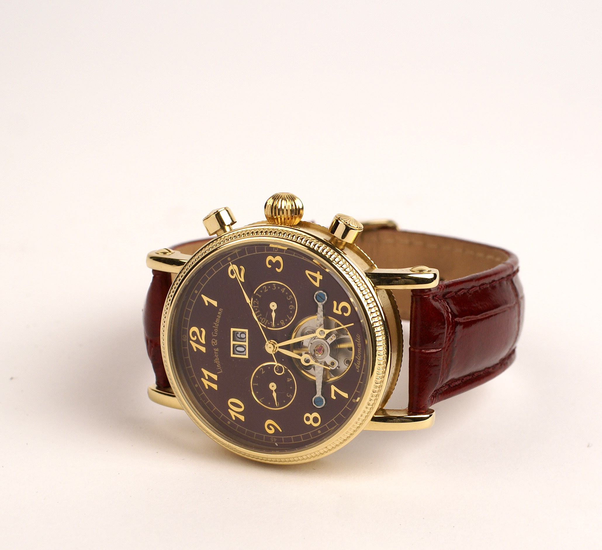 OROLOGIO DA POLSO SCHELETRICO LINDERG & GOLDMANN cassa circolare in acciaio 42mm, movimento meccanico a carica automatica, bracciale in pelle