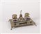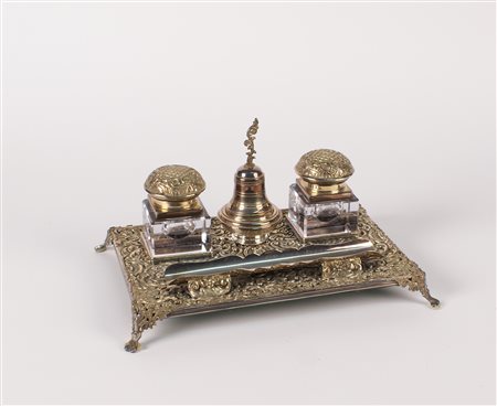 CALAMAIO IN ARGENTO Italia vecchia manifattura vassoio rettangolare con due ampolle in vetro e campanello poggiante su quattro piedini a voluta 15x28x20 cm.