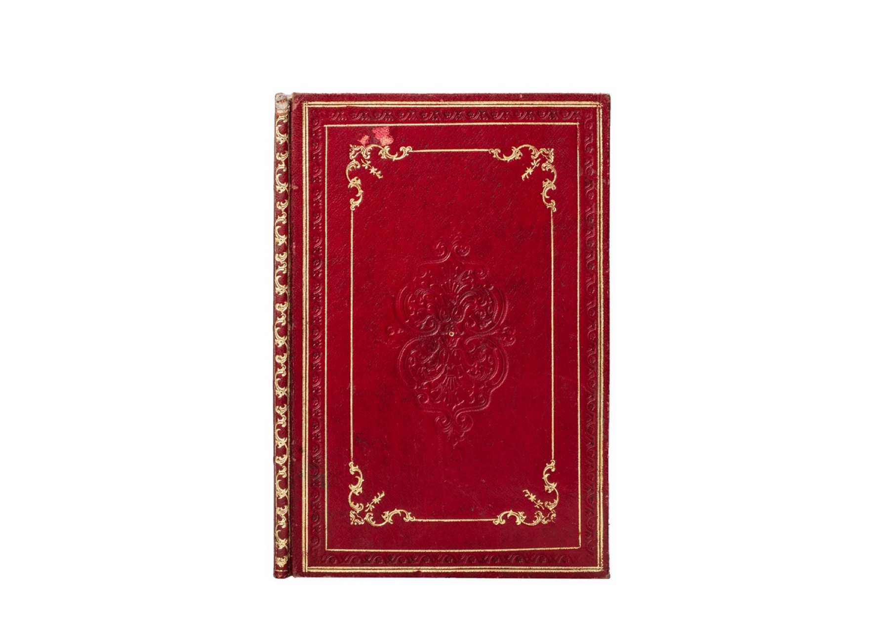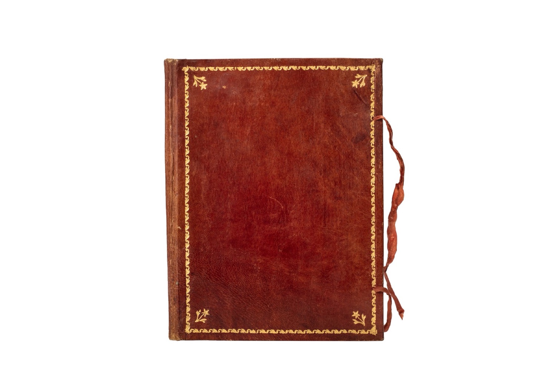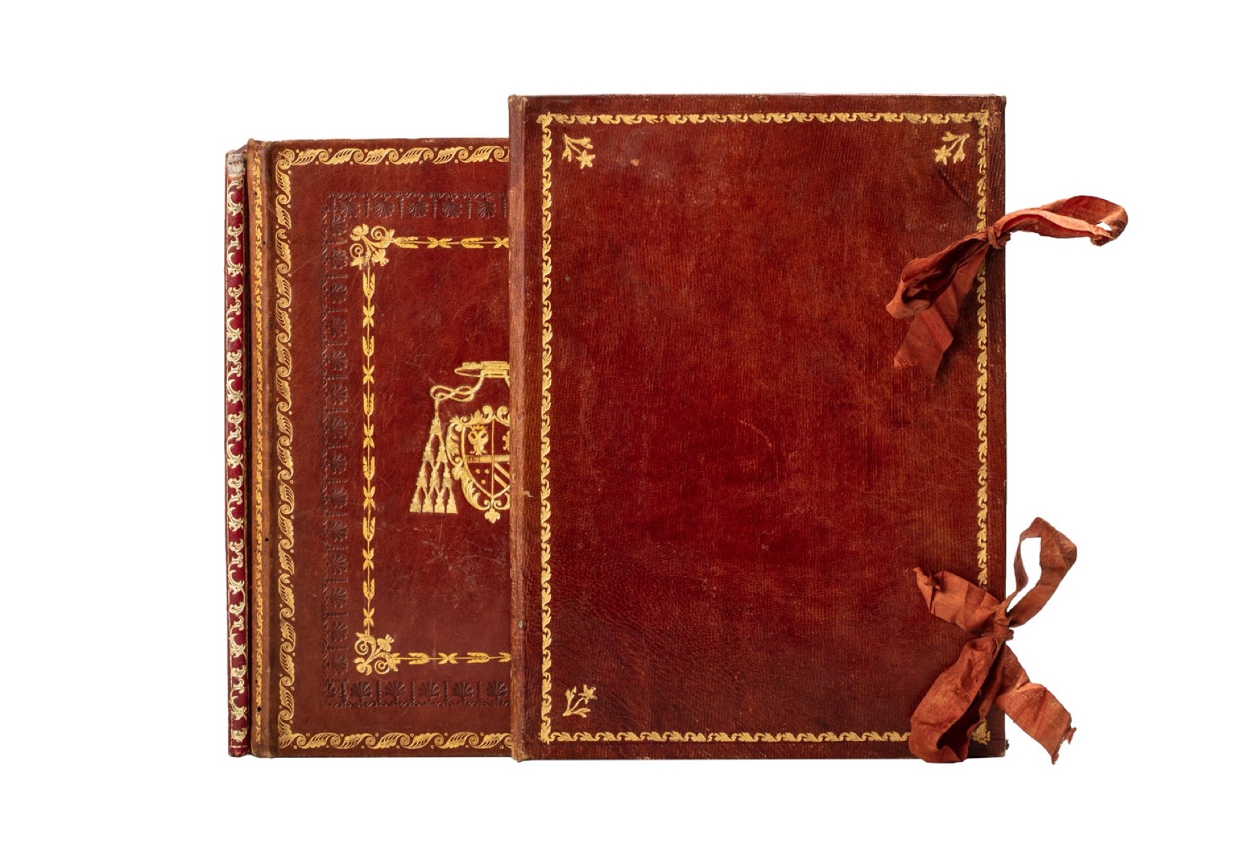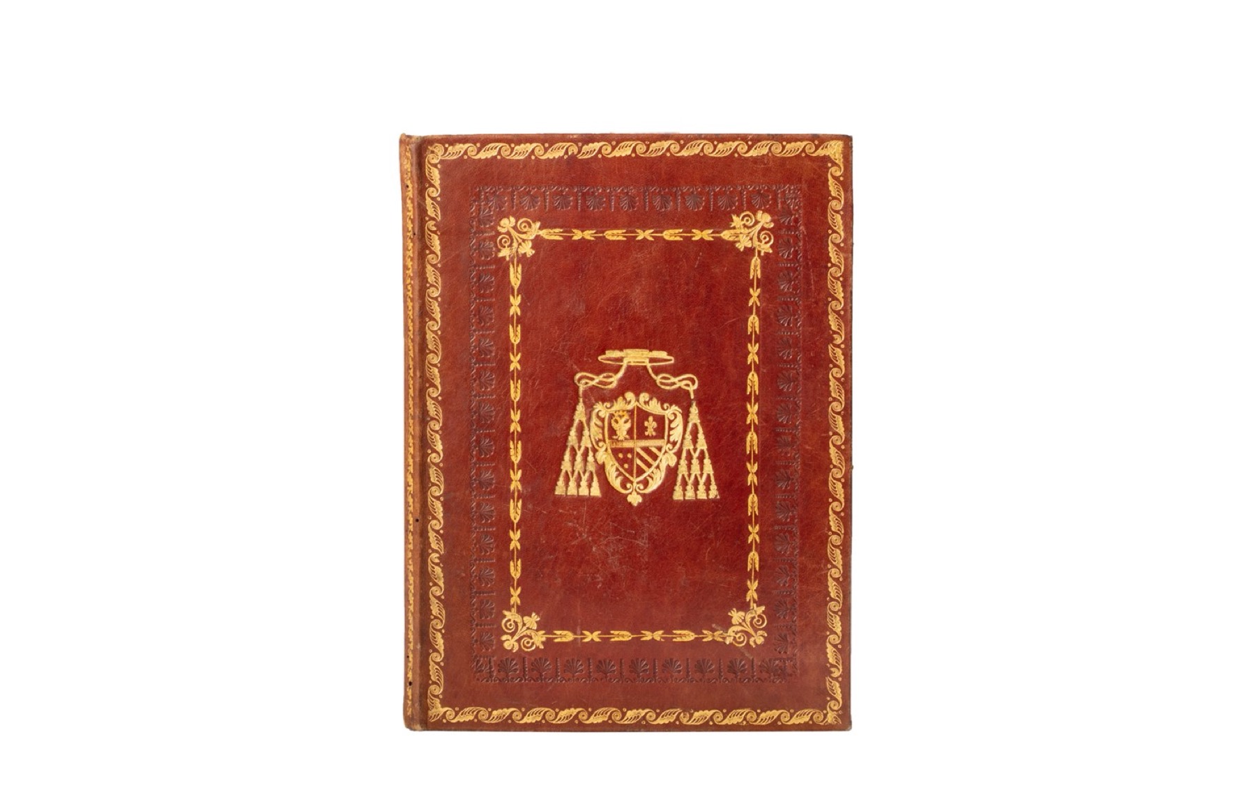 [Roma, 1882]. mm. 222 x 160. 4 carte su pergamena, testo in corsivo stampato in rosso e nero e, inquadrato da duplice filetto in rosso, ai margini superiori alle carte 1 e 2 "Bollo straordinario Roma" e "Bai nove Roma", firma manoscritta del protonotaio al verso di carta 4, in fine sigillo cartaceo timbro di registro degli atti, legatura coeva in marocchino marrone, piatti inquadrati da cornice impressa in oro, fiocchi in raso.
