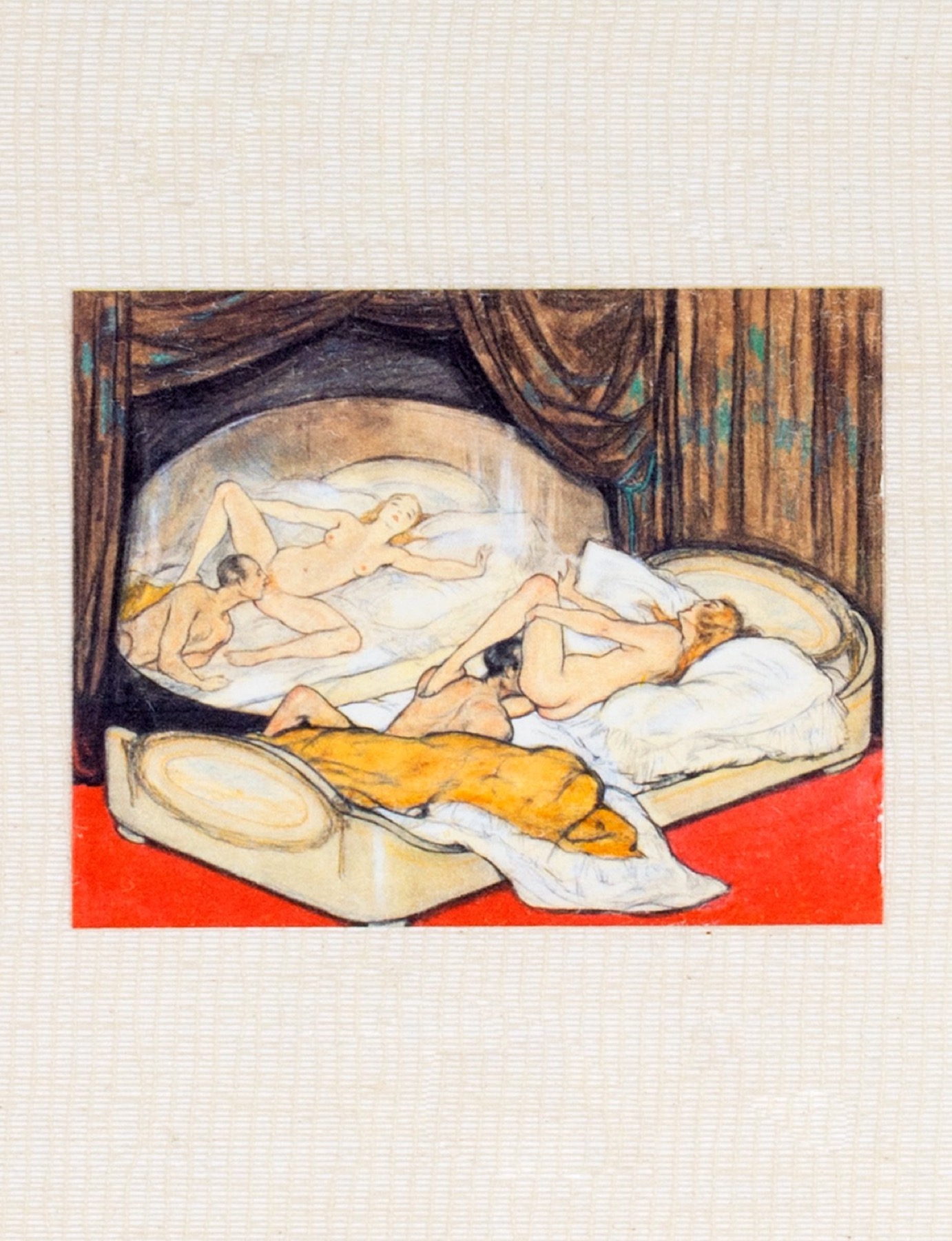 Bologna, Sintesi, 1995. Con dodici tavole a colori ciascuna contenuta in cartellina, fascicoli di testo sciolti conservati in cartellina in tessuto avorio con illustrazione applicata al piatto anteriore, astuccio in tela verde con titolo e silhouette di donna impressi in color rame.
