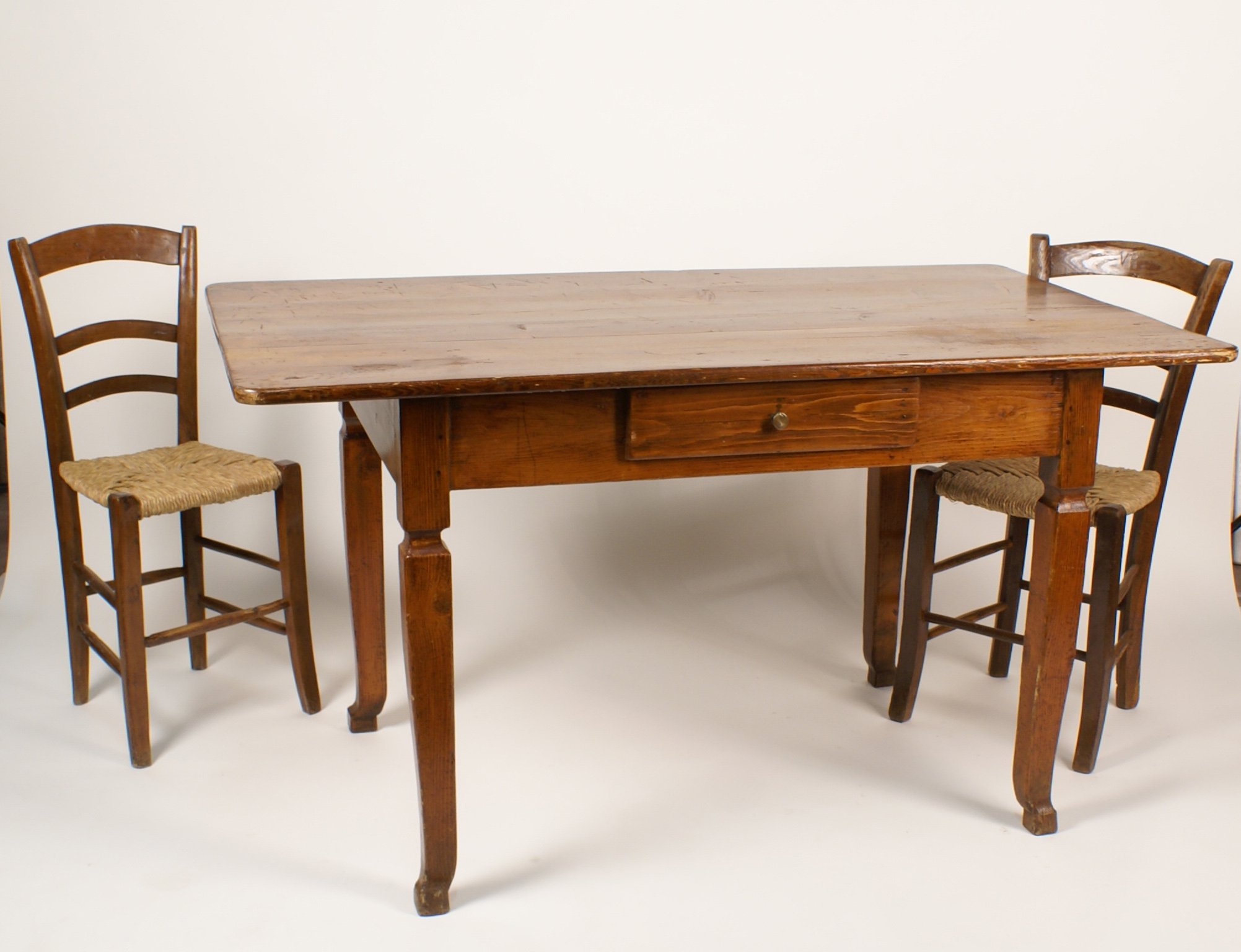 TAVOLO E QUATTRO SEDIE vecchia manifattura in pioppo, piano rettangolare con un cassetto sottostante 82x151x86 cm.