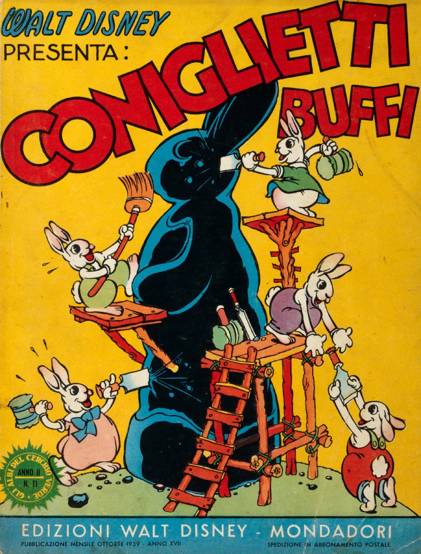 Milano, Disney-Mondadori, [1936]. mm. 213 x 148. Con 24 tavole, di cui 18 a piena pagina a colori ed in bianco e nero e 6 nel testo, cartoncino editoriale illustrato, lievi difetti alla legatura. § Insieme nel lotto Coniglietti buffi, Milano, Disney-Mondadori, 1939. mm. 230 x 179. Con 14 tavole a colori a piena pagina e illustrazioni nel testo, qualche leggera arrossatura sparsa, copertina editoriale con i piatti completamente illustrati a colori, lievi pieghe.