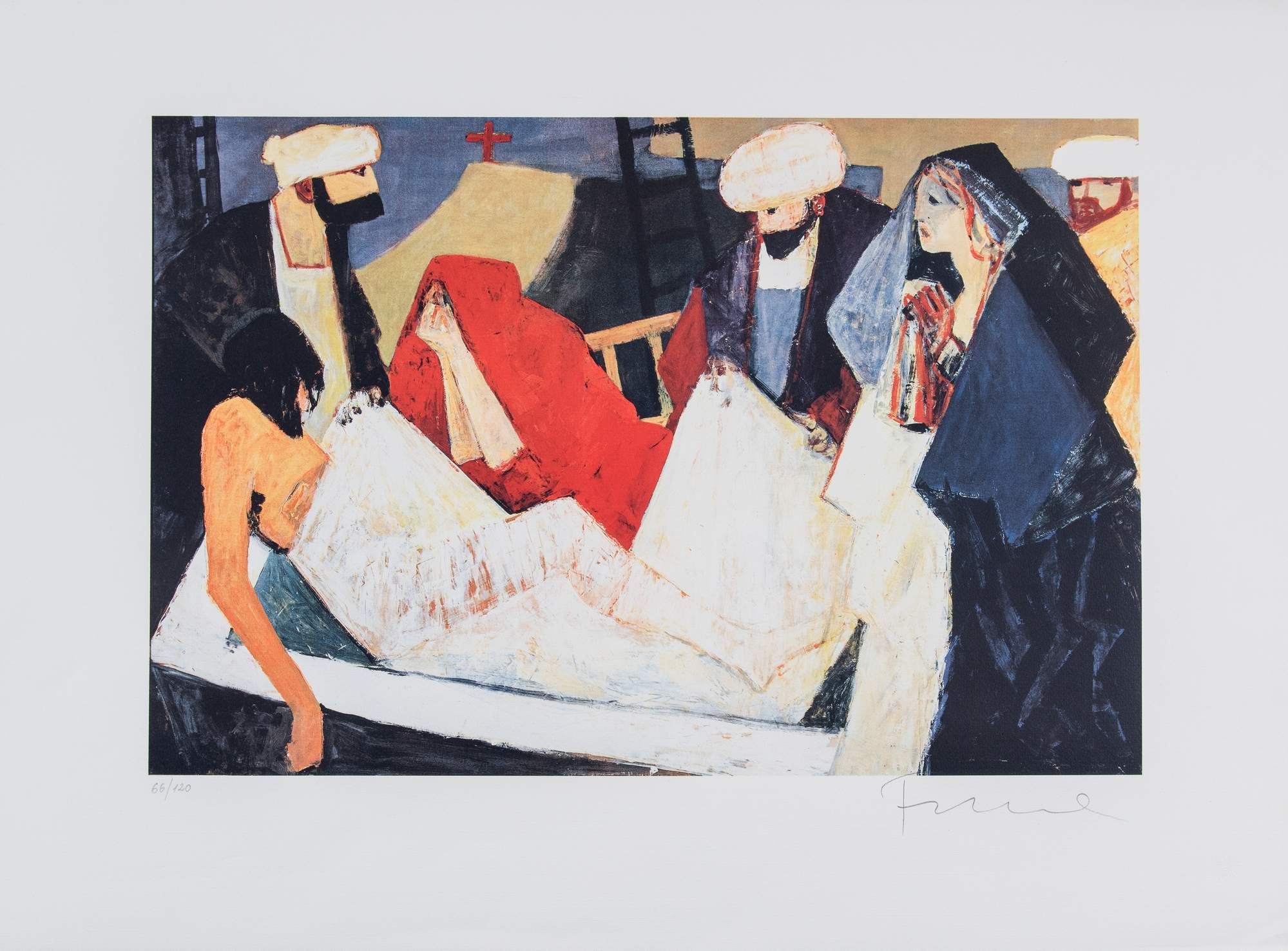 SALVATORE FIUME (Comiso 1915 - Milano 1997) "Deposizione". Litografia a colori su carta. Cm 60x80. Opera firmata in basso a destra Fiume. Reca numeri di tiratura in basso a sinistra 66/120. In basso a destra e in alto a destra reca timbri Salvatore Fiume.