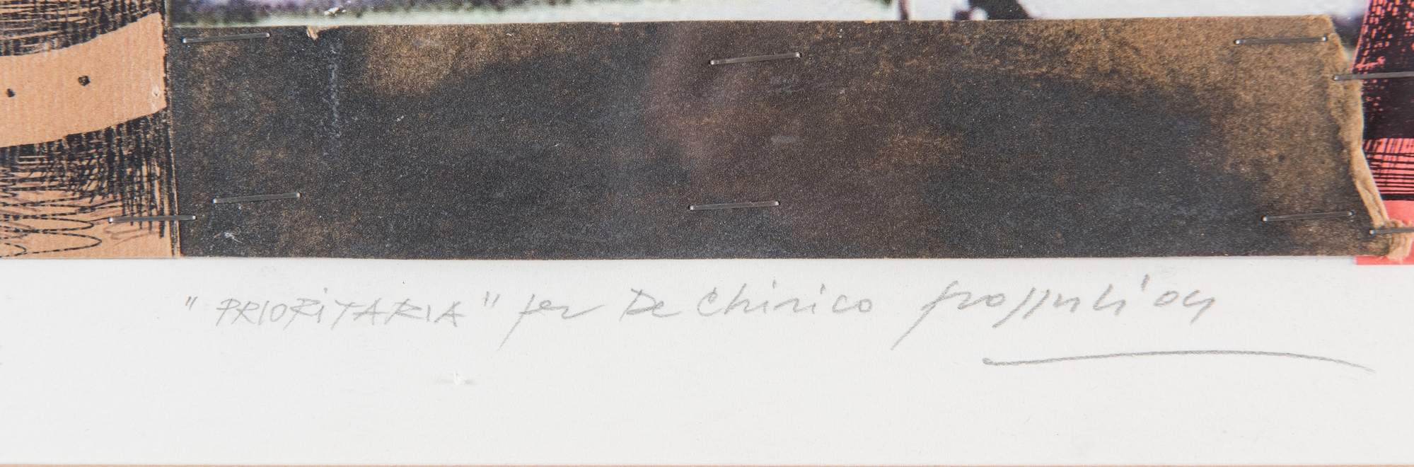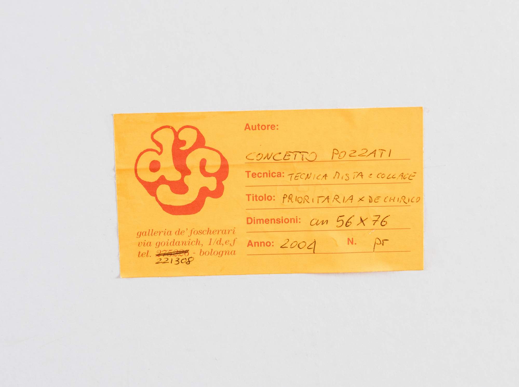 CONCETTO POZZATI (Vo’ 1935 – Bologna 2017) “”Prioritaria” per De Chirico”, 2004. Tecnica mista, collage su cartoncino. Cm 55x75. Opera firmata, intitolata e datata in basso al centro “Prioritaria” per De Chirico Pozzati 04. Al retro reca etichetta della Galleria De Foscherari, Bologna. Provenienza: importante collezione privata, Bologna.