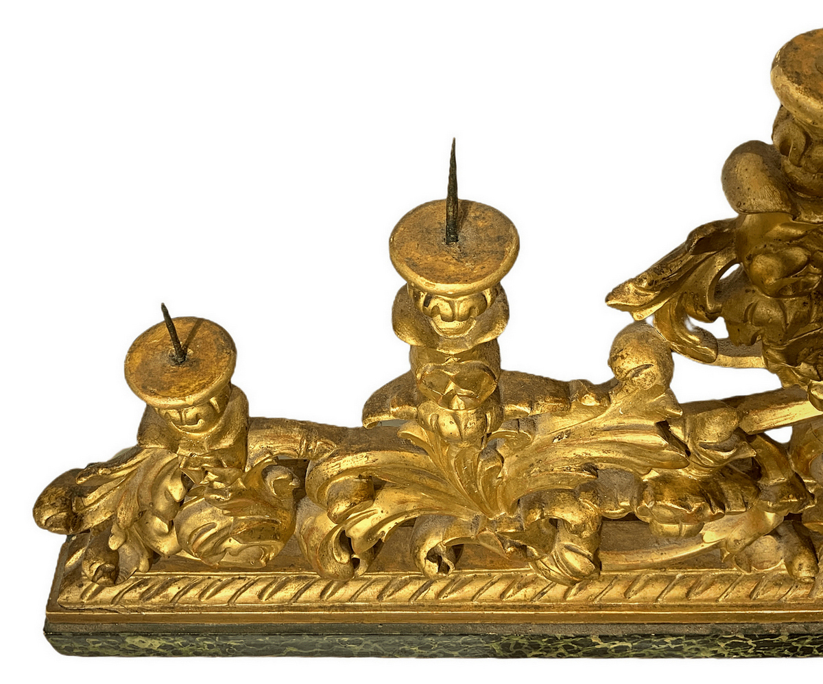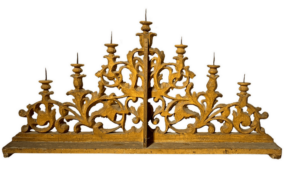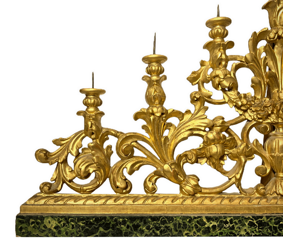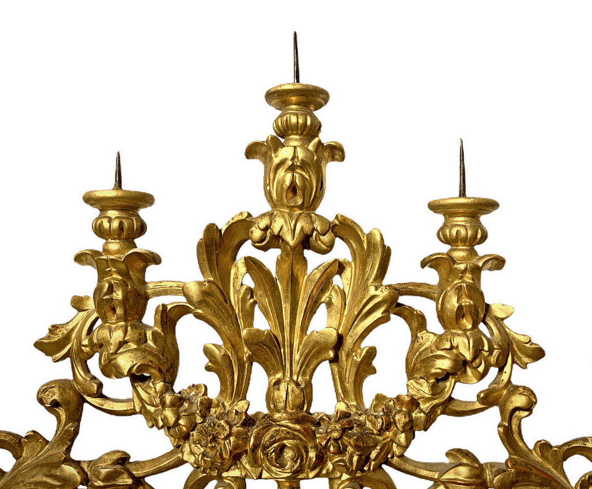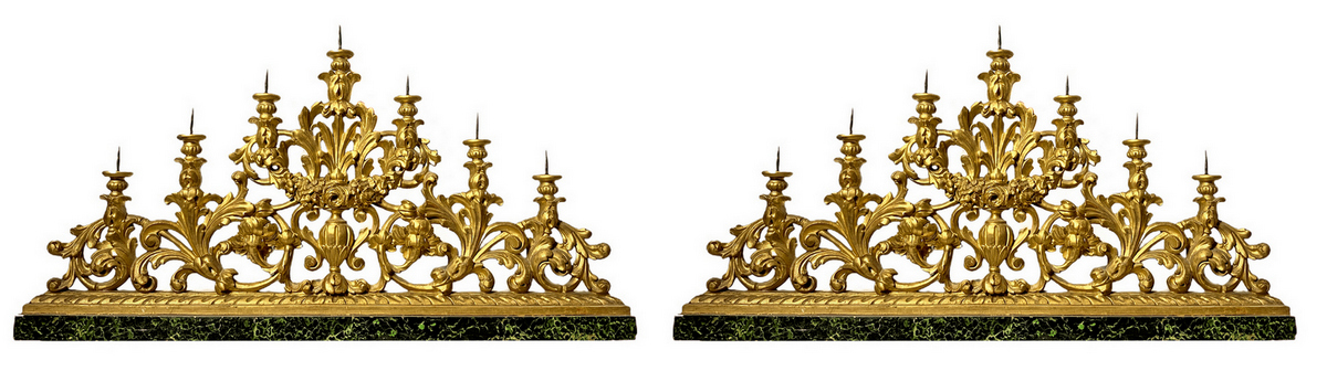 Coppia di candelabri a sette luci in legno dorato a foglia a forma piramidale. Fine XVIII secolo. Base cm 112x14, altezza cm 60