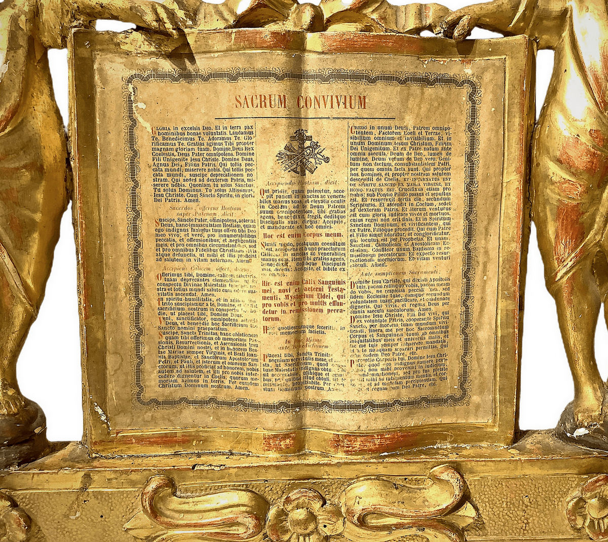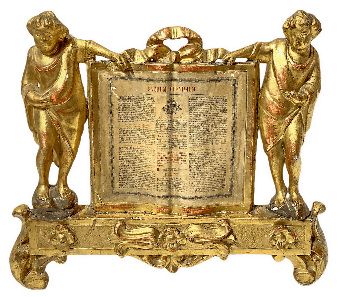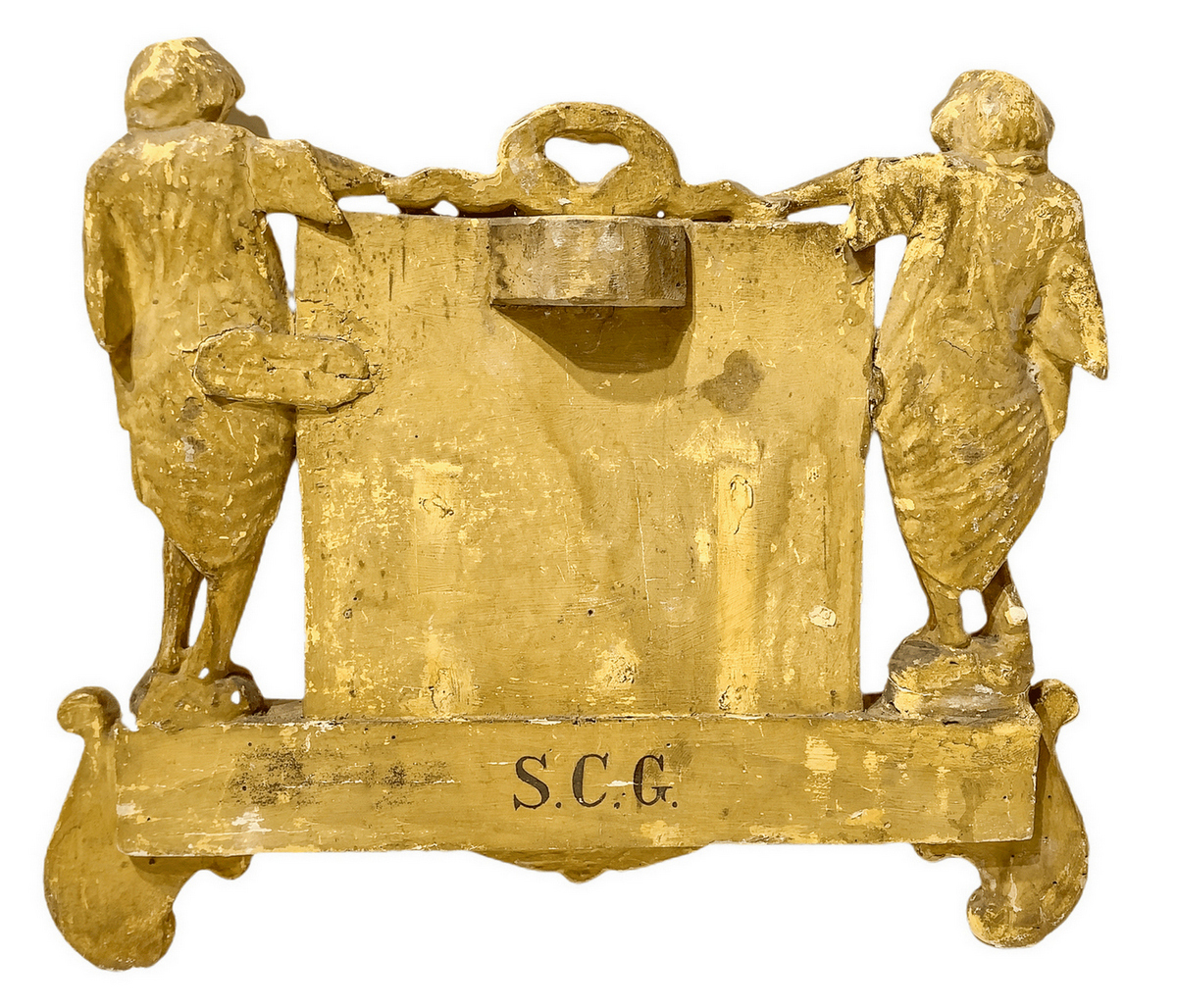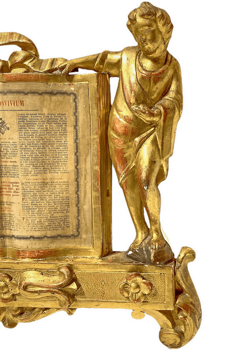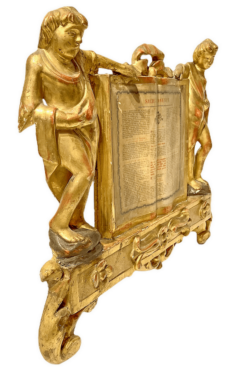 Cartagloria in legno dorato con a latere scultura di due giovani. XVIII secolo.