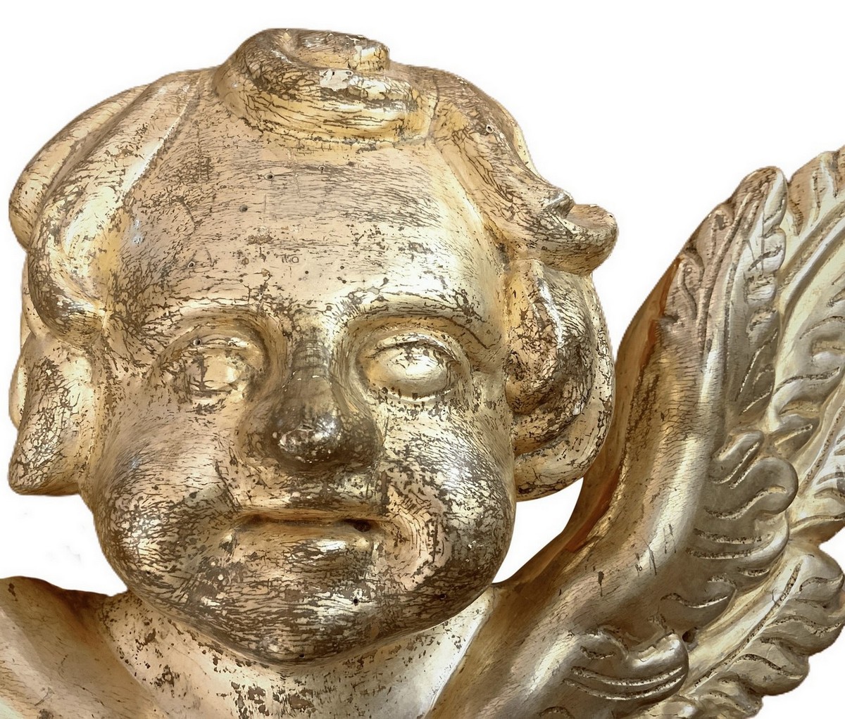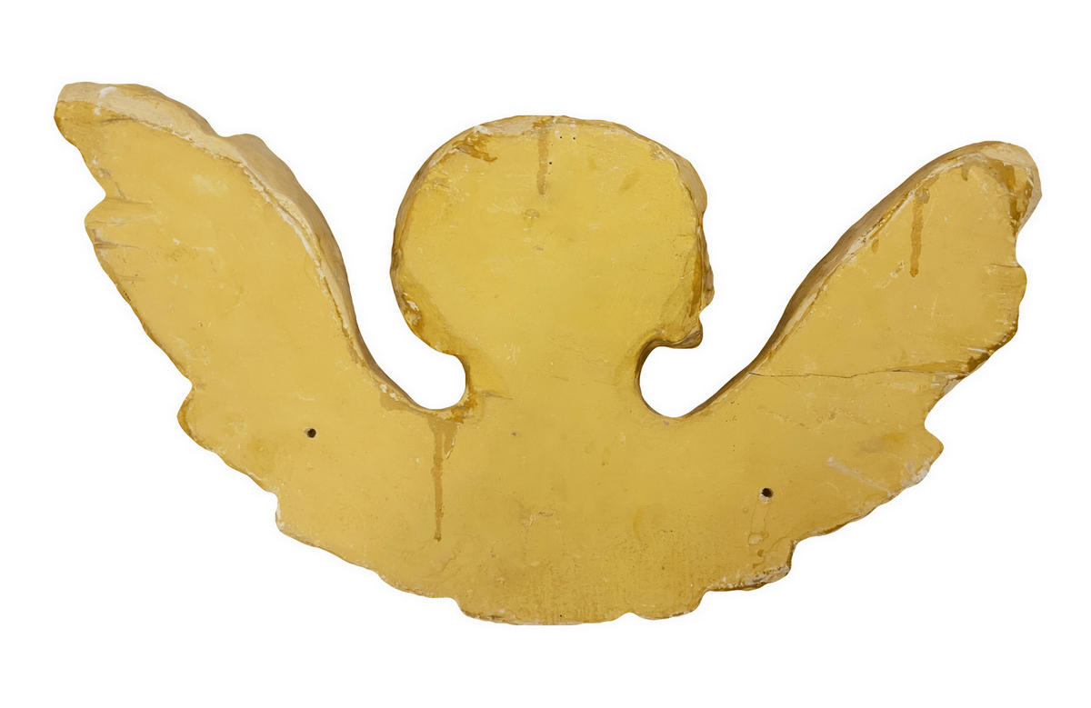 Scultura di angelo con ali spiegate in legno dorato a foglia, XIX secolo. Cm 65x34. Spessore cm 18