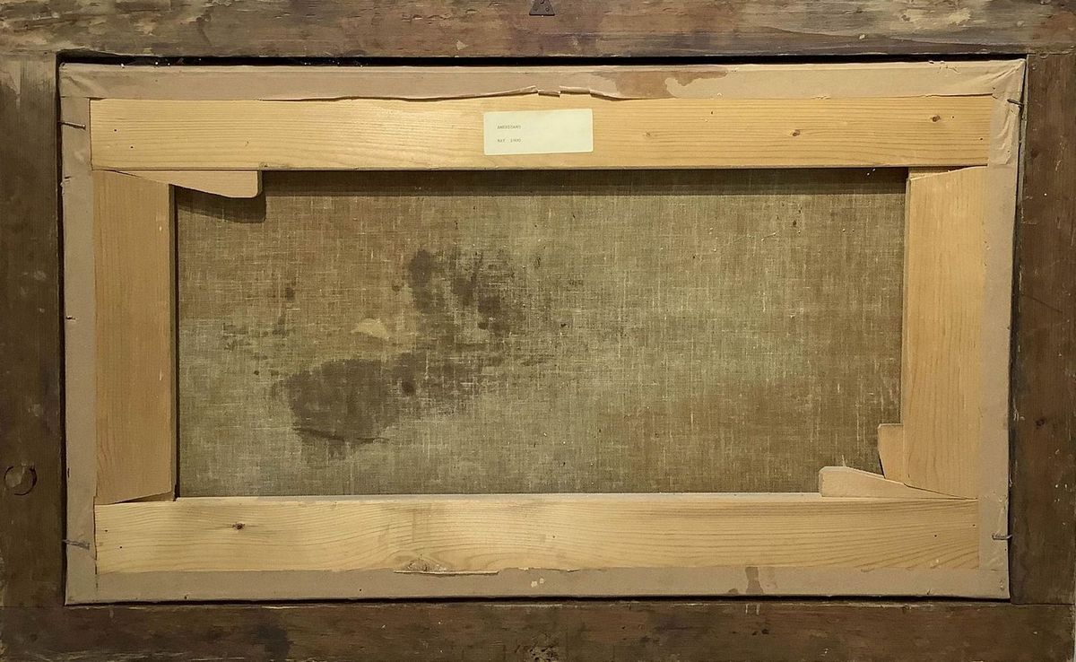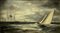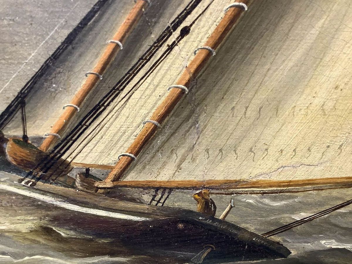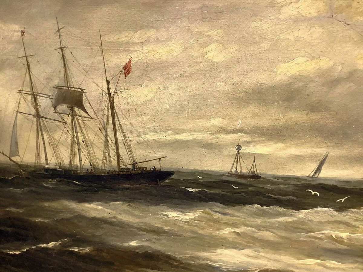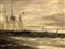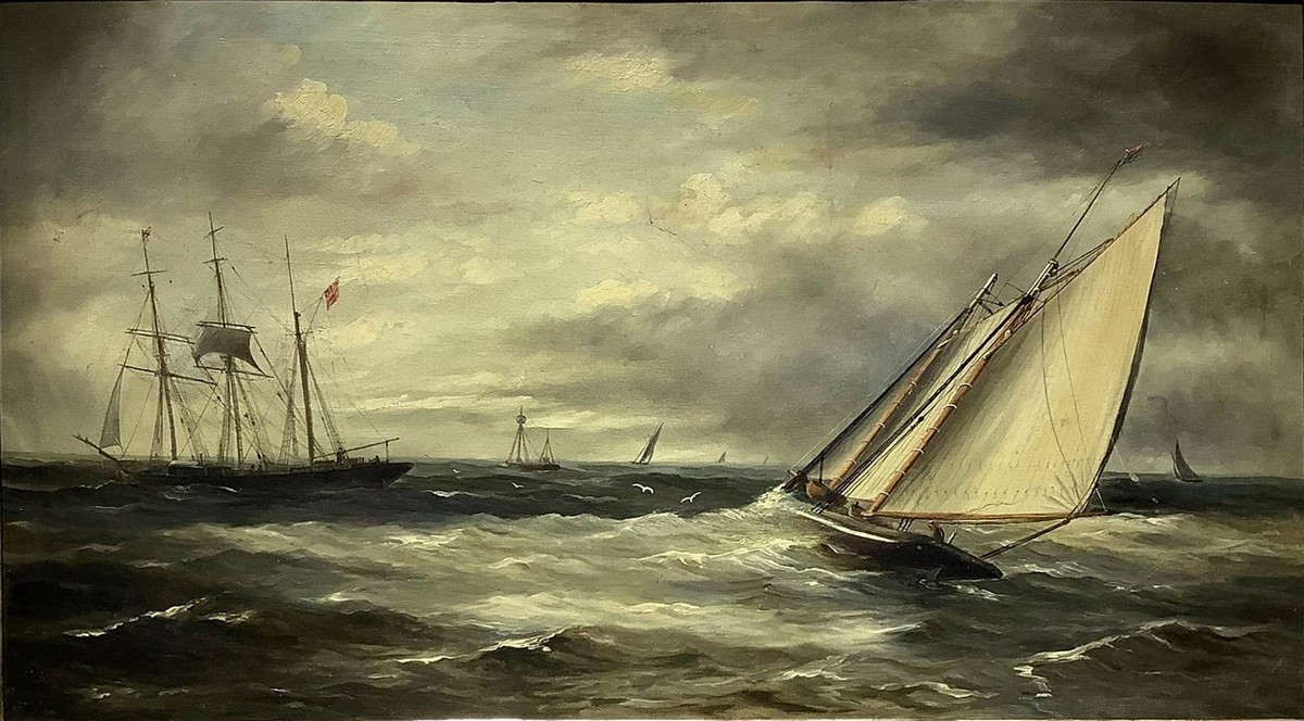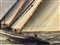 Dipinto ad olio su tela. Barche in mare, pittore del XIX secolo. Cm 45x77.