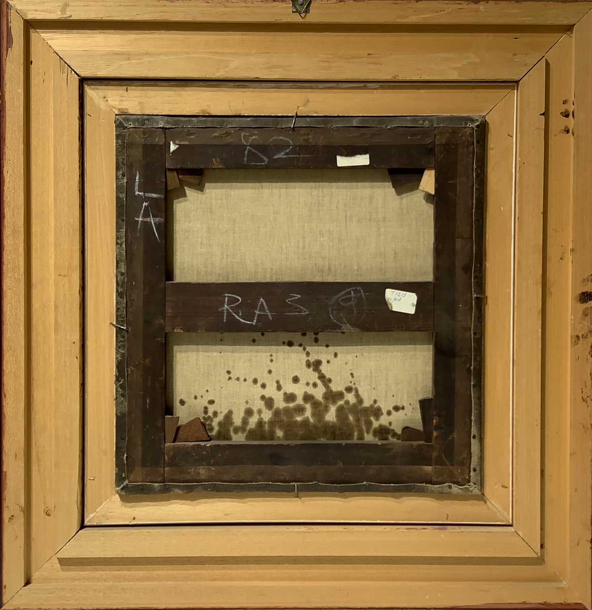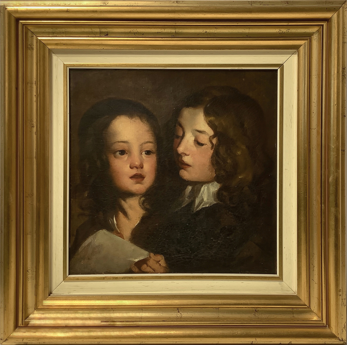 Dipinto ad olio su tela raffigurante viso di ragazzo e ragazza con lettera, pittore della prima metà del XIX secolo. Cm 45x45, in cornice cm 70x70