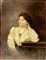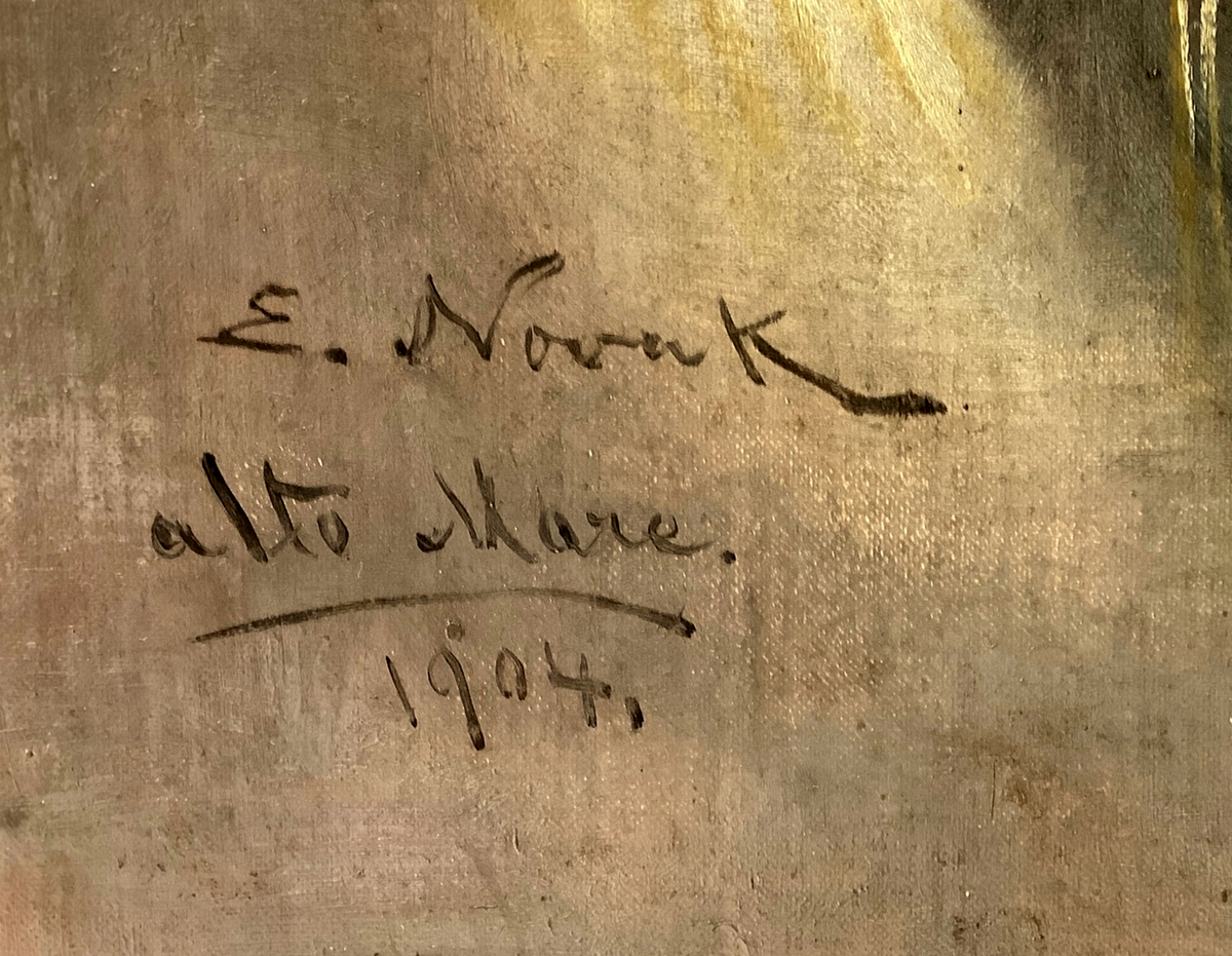 Dipinto ad olio su tela applicata a cartone, raffigurante donna, firmato in basso a sinistra E. Nowak. Riportante scritta alto mare e datato 1904. Cm 42x30, in cornice cm 57x45