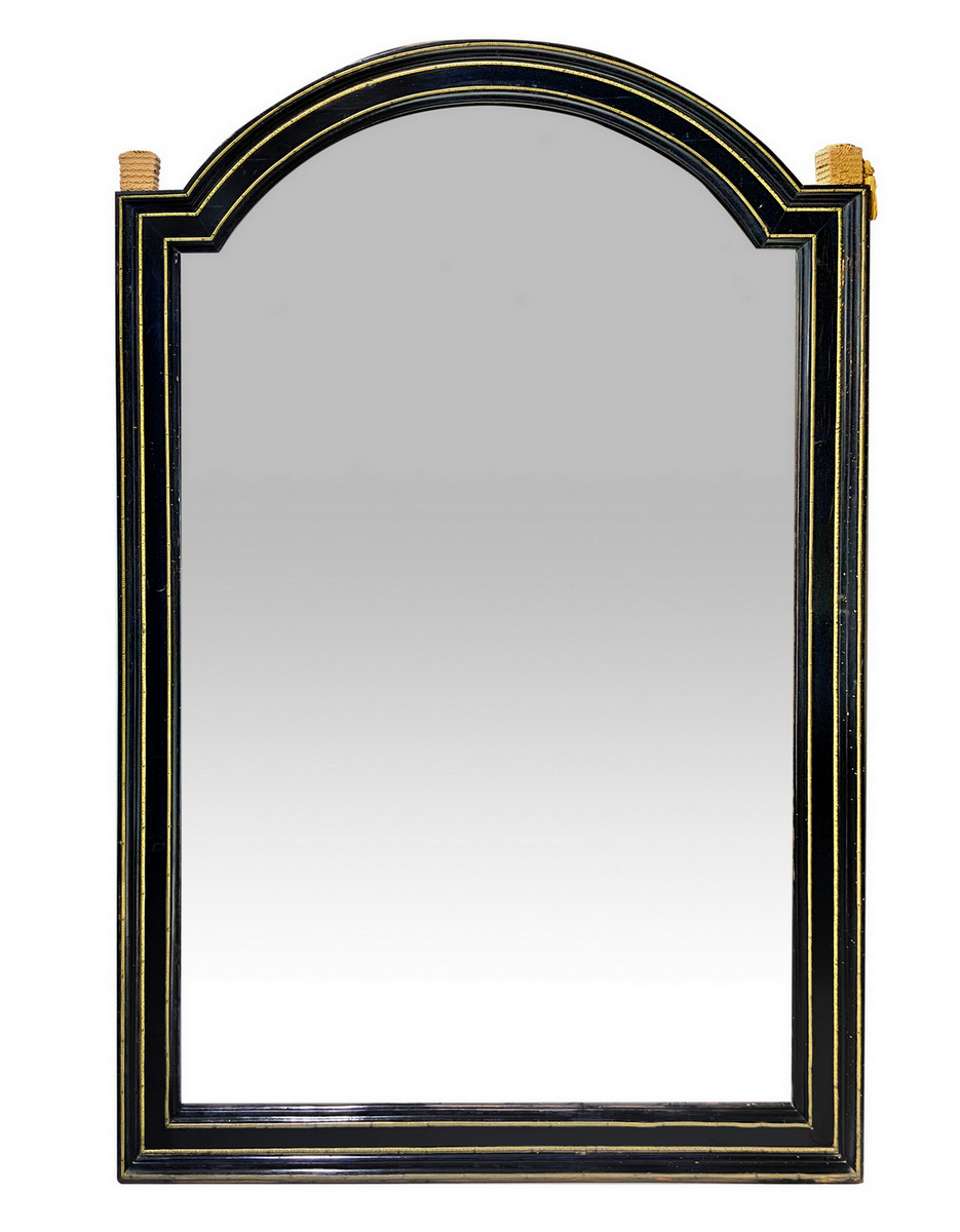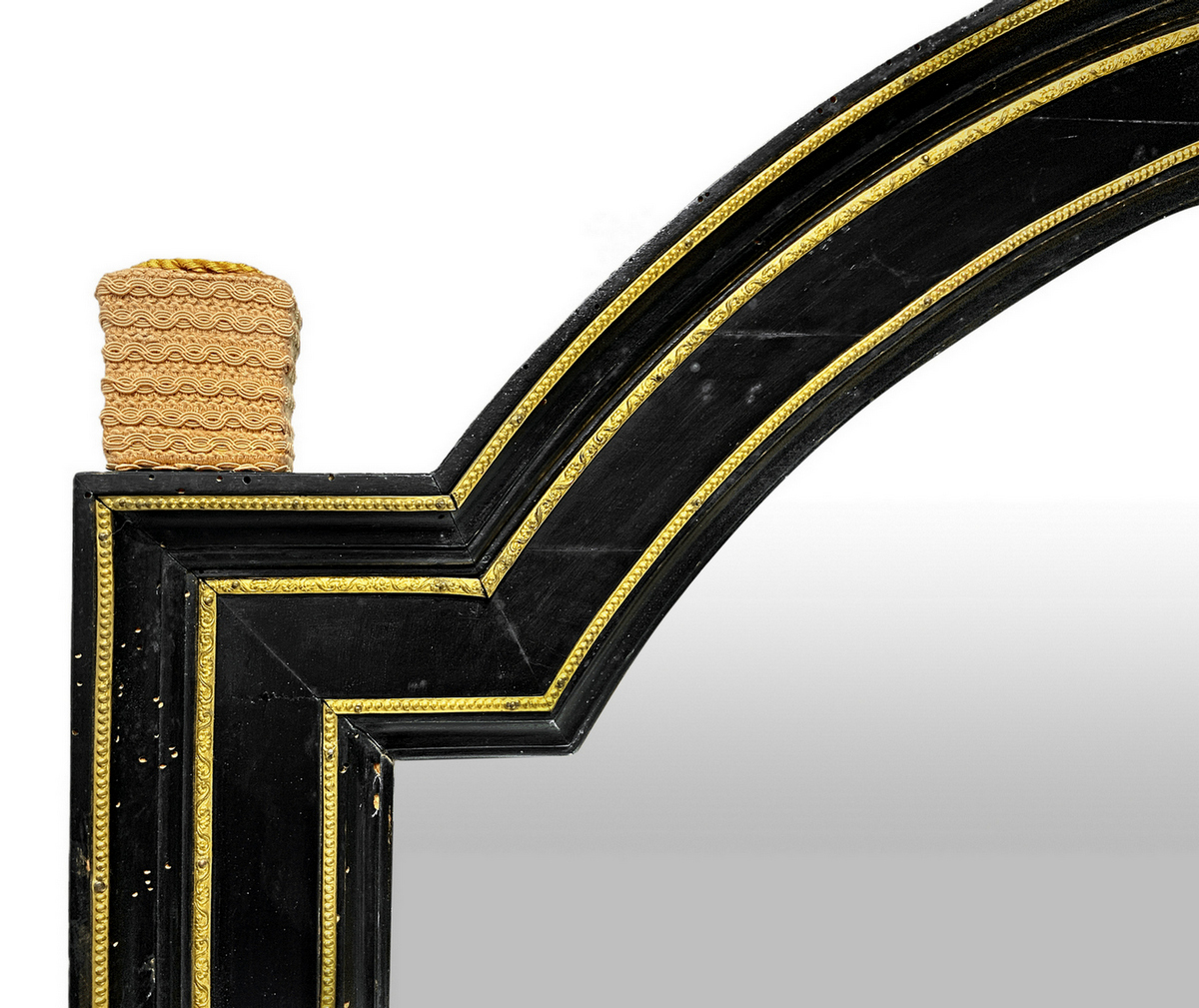 Specchiera in legno laccato nero e perfilato in ottone dorato di forma rettangolare con lato superiore ad arco, Napoleone III, fine XIX secolo. Cm 186x120