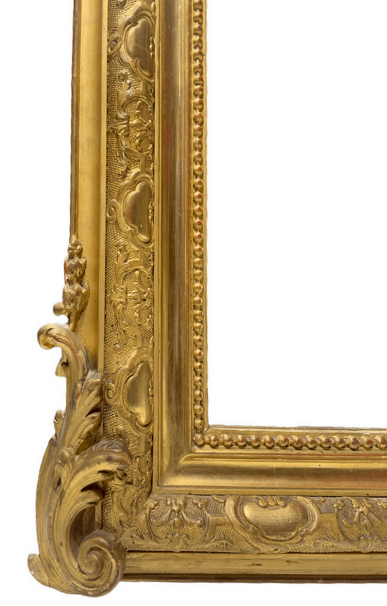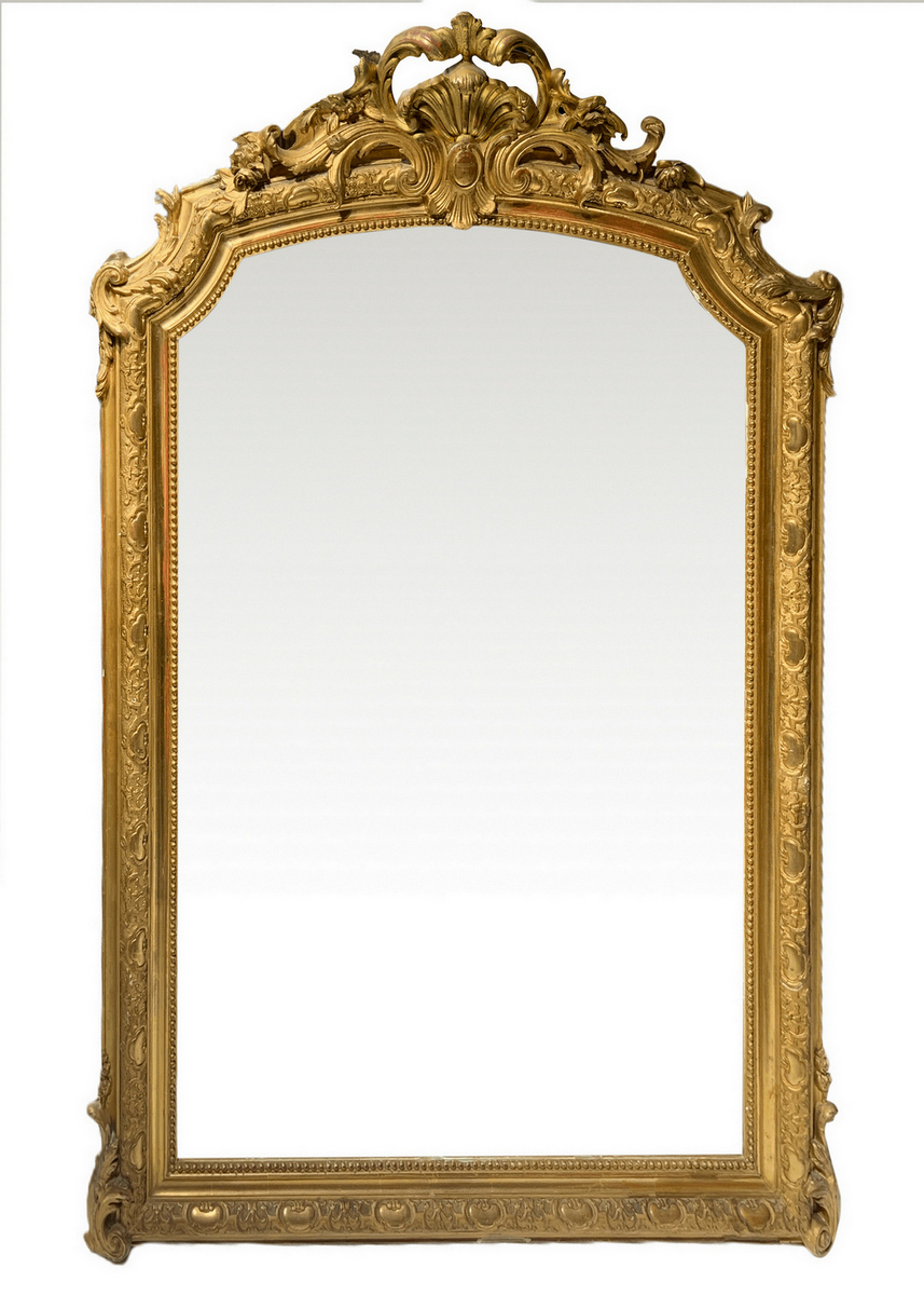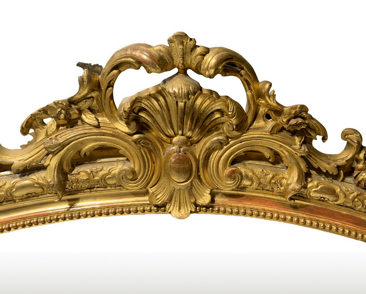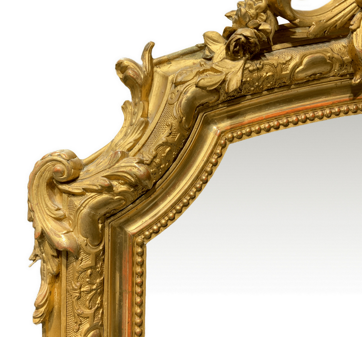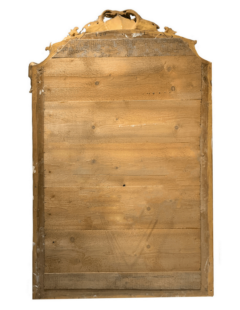 Specchiera in legno dorato a foglia sormontata da cimasa. Cm 155x110