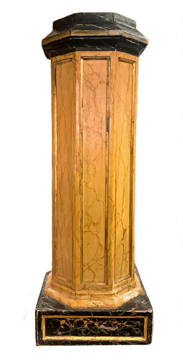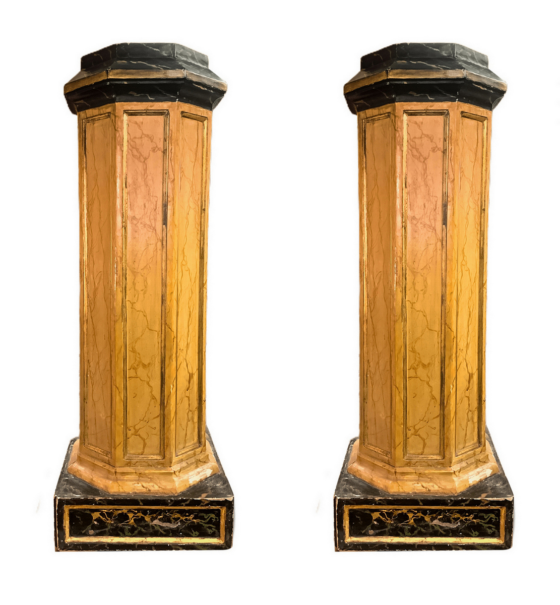 Coppia di colonne esagonali laccate a finto marmo, XVIII secolo, Sicilia. H cm 135. Base quadrata cm 47x47. Piano esagon