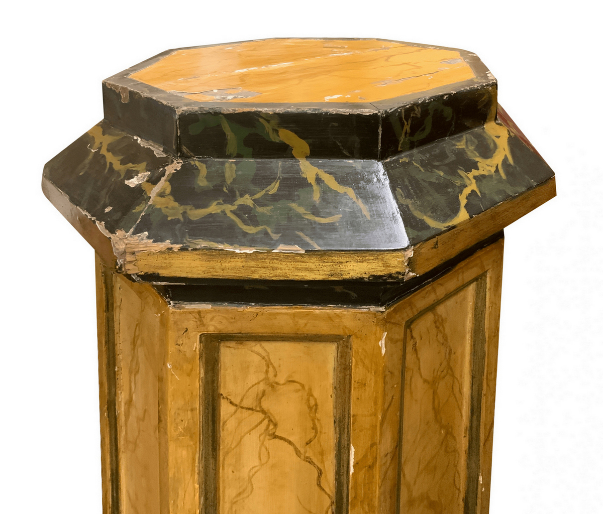 Coppia di colonne esagonali laccate a finto marmo, XVIII secolo, Sicilia. H cm 135. Base quadrata cm 47x47. Piano esagonale cm 35x35