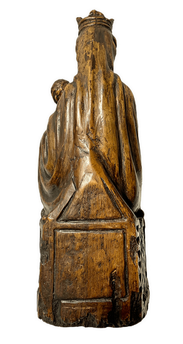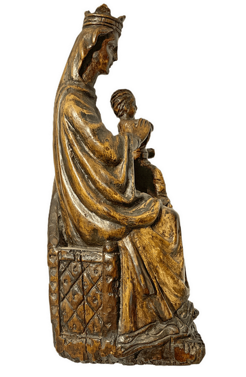 Statua lignea raffigurante Madonna con bambino, XV/XVI secolo. H cm 42. Base cm 18x15