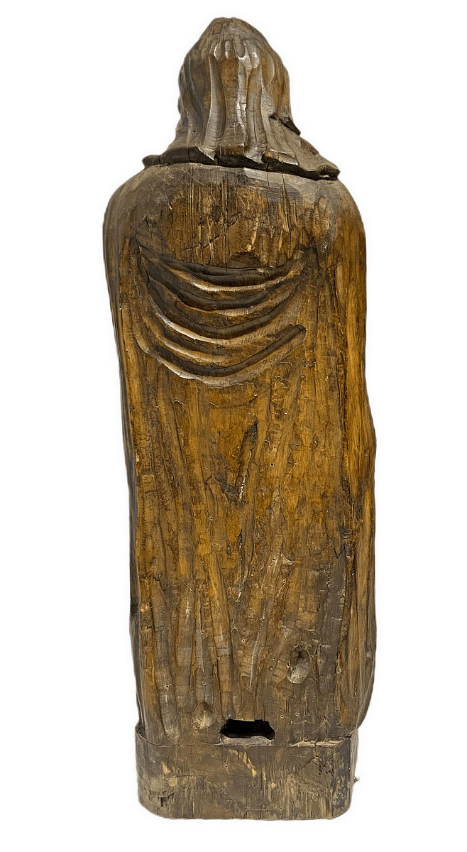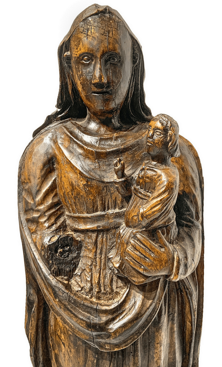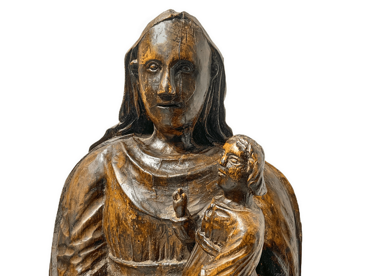 Scultura raffigurante Madonna e bambino benedicente, scultore tedesco del XV secolo. H cm 83. Base cm 25x17
