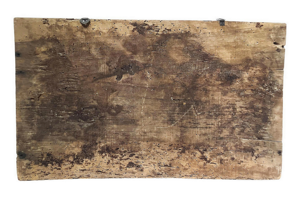 Frammento di fregio in legno di noce scolpito raffigurante Santa Barbara con puttini e satiri, XVII/XVIII secolo. Cm 42x67