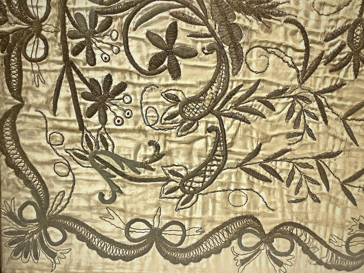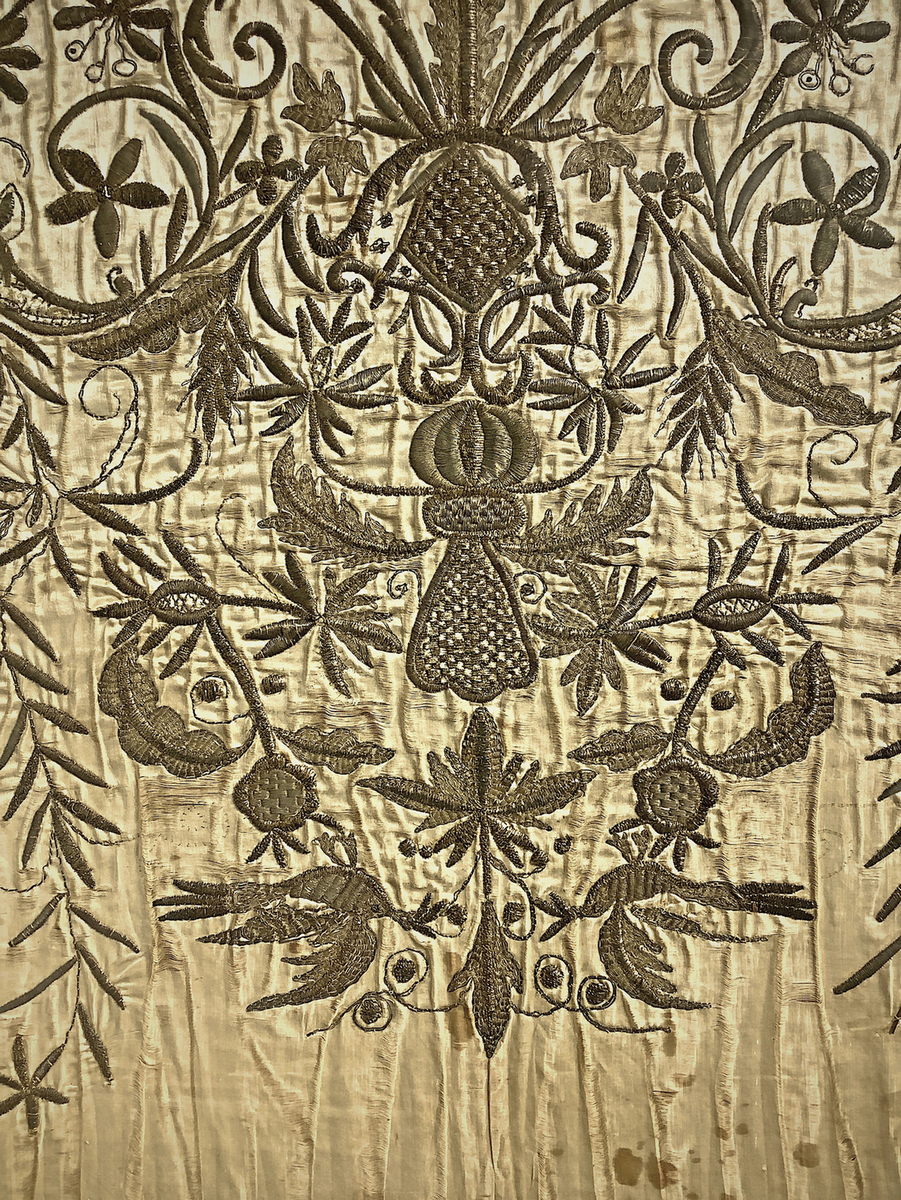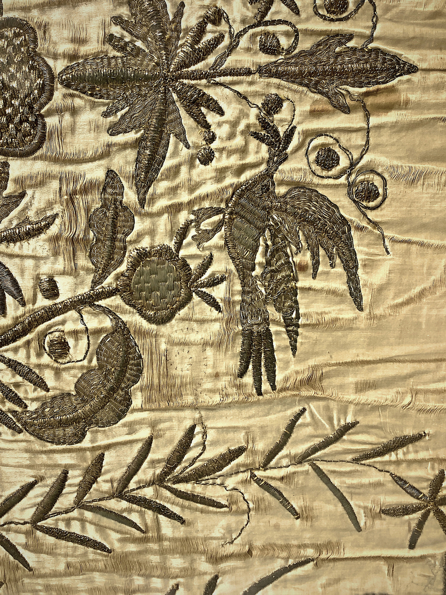 Paliotto ricamato in oro raffigurante ramage con vaso e foglie. XVIII secolo. In cornice cm 91x110