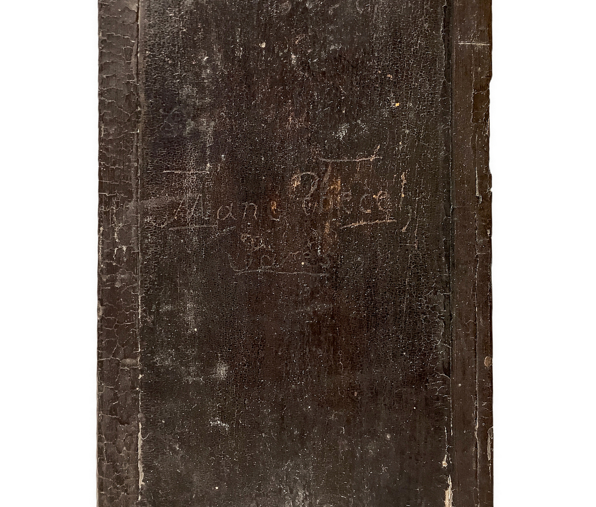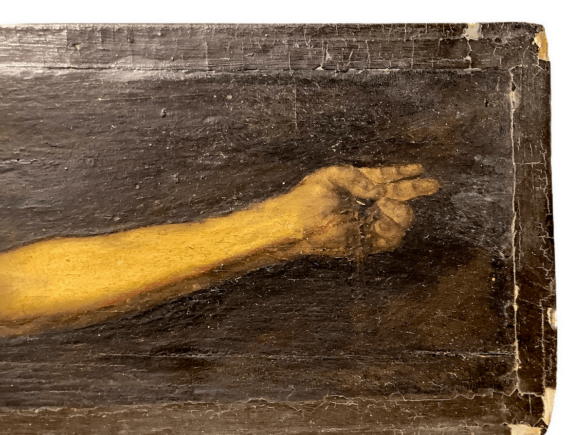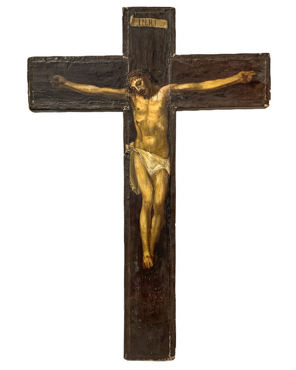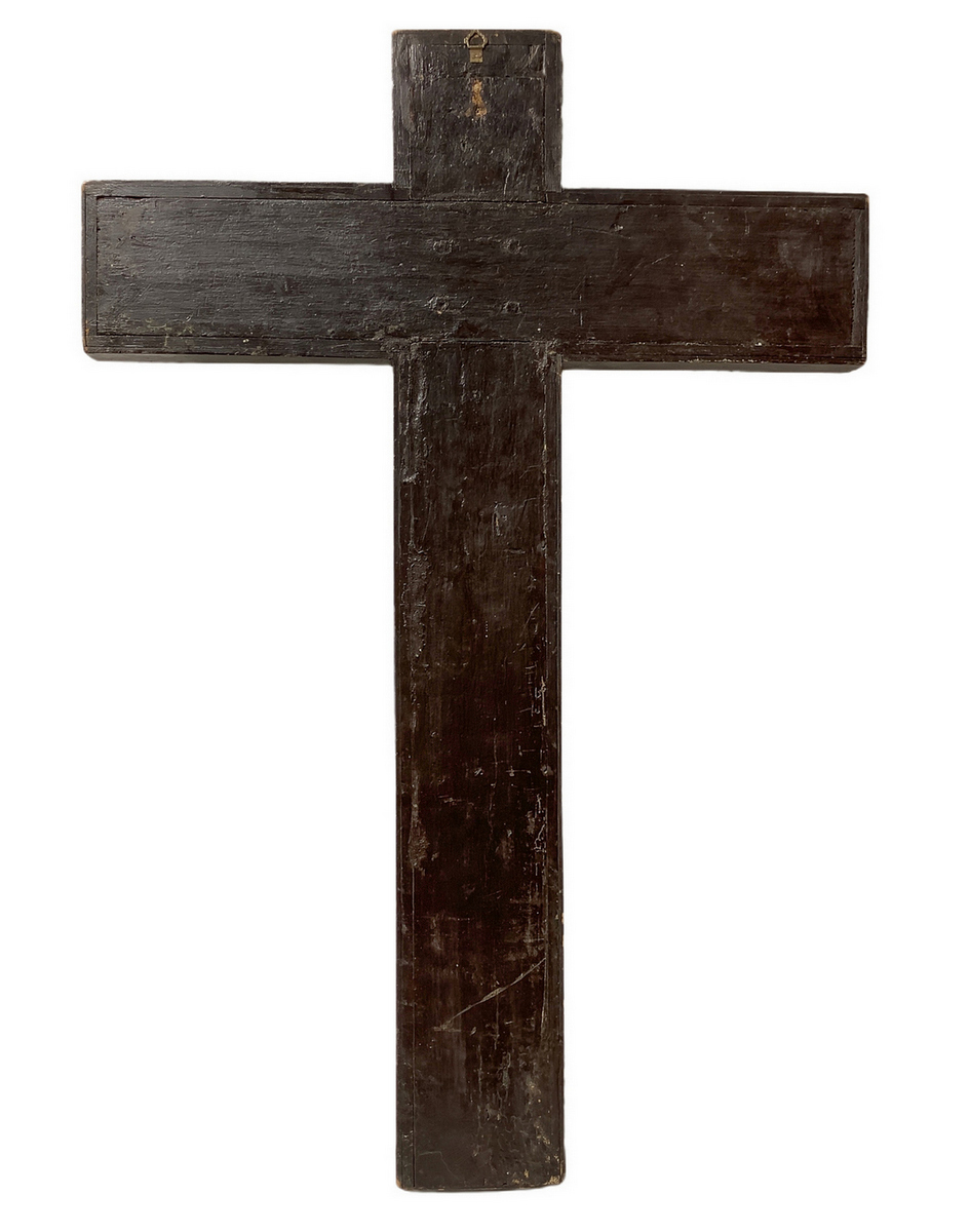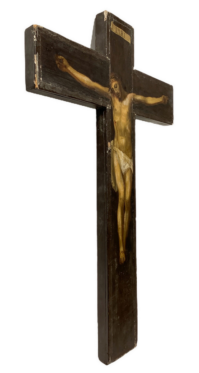 Croce in legno con dipinto Cristo cricifisso policromo, XVIII secolo. H cm 77x52