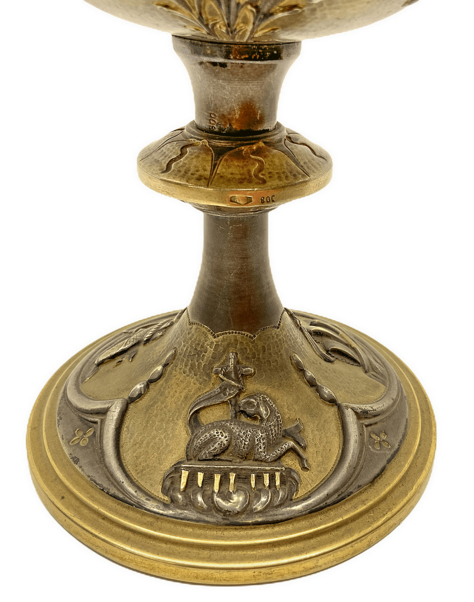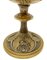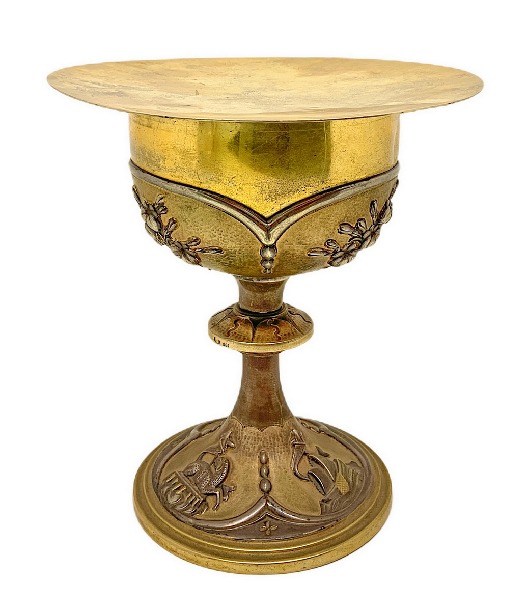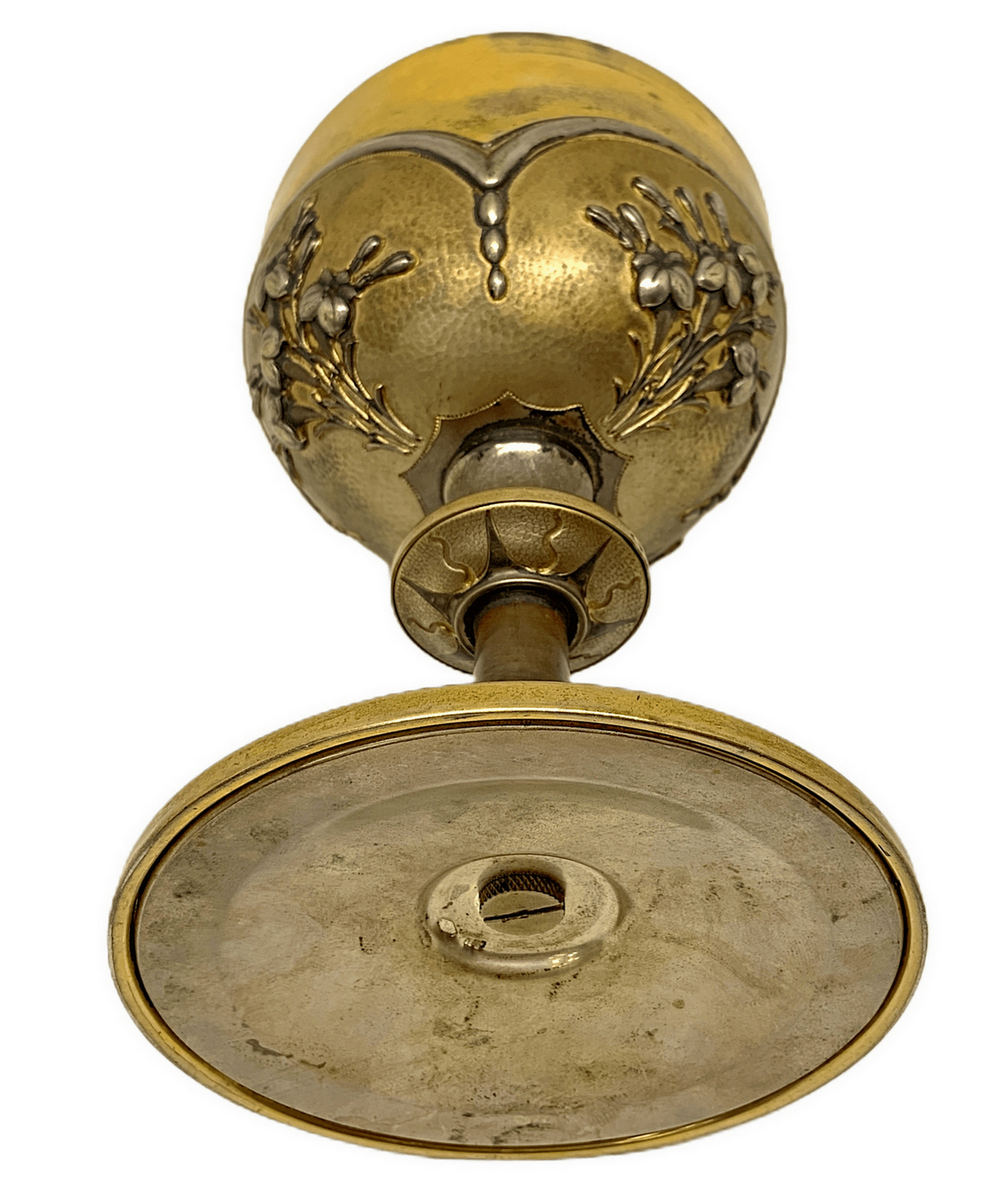 Calice con patena in argento vermeil decorato a sbalzo con motivi floreali, primi XX secoli. Sulla base simboli religios