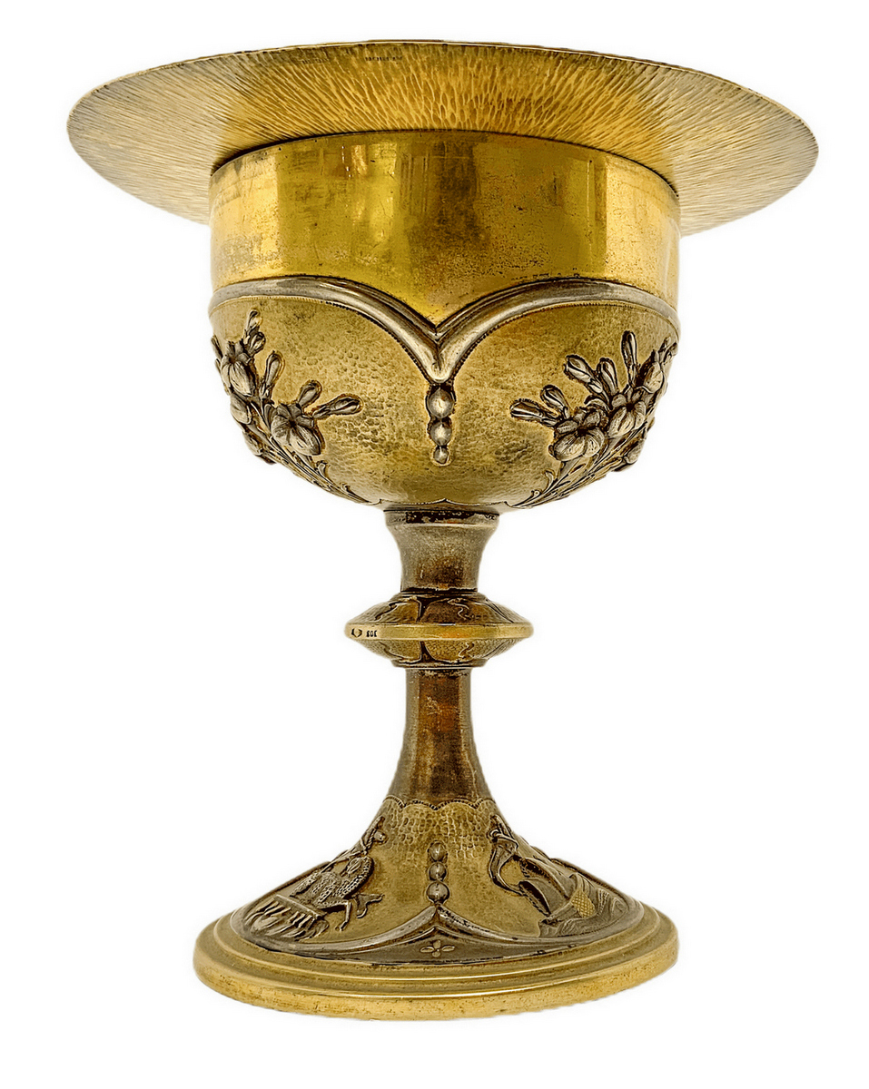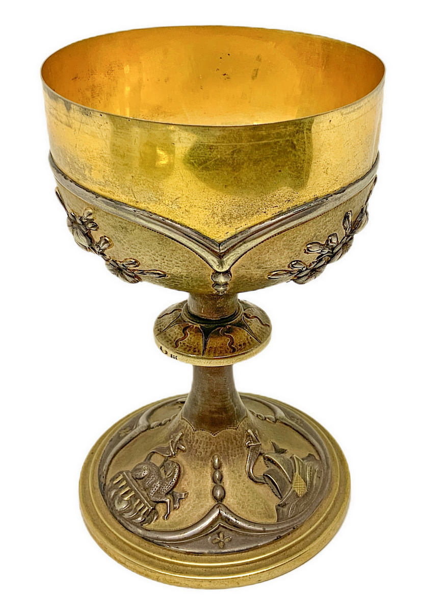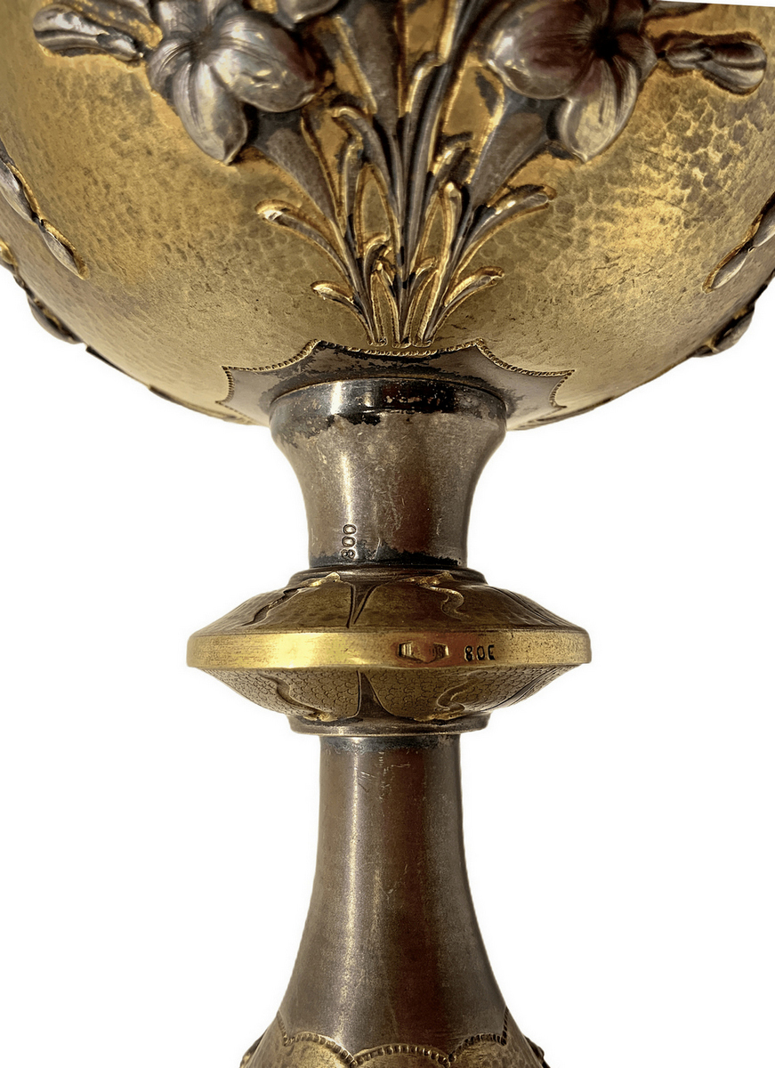Calice con patena in argento vermeil decorato a sbalzo con motivi floreali, primi XX secoli. Sulla base simboli religios