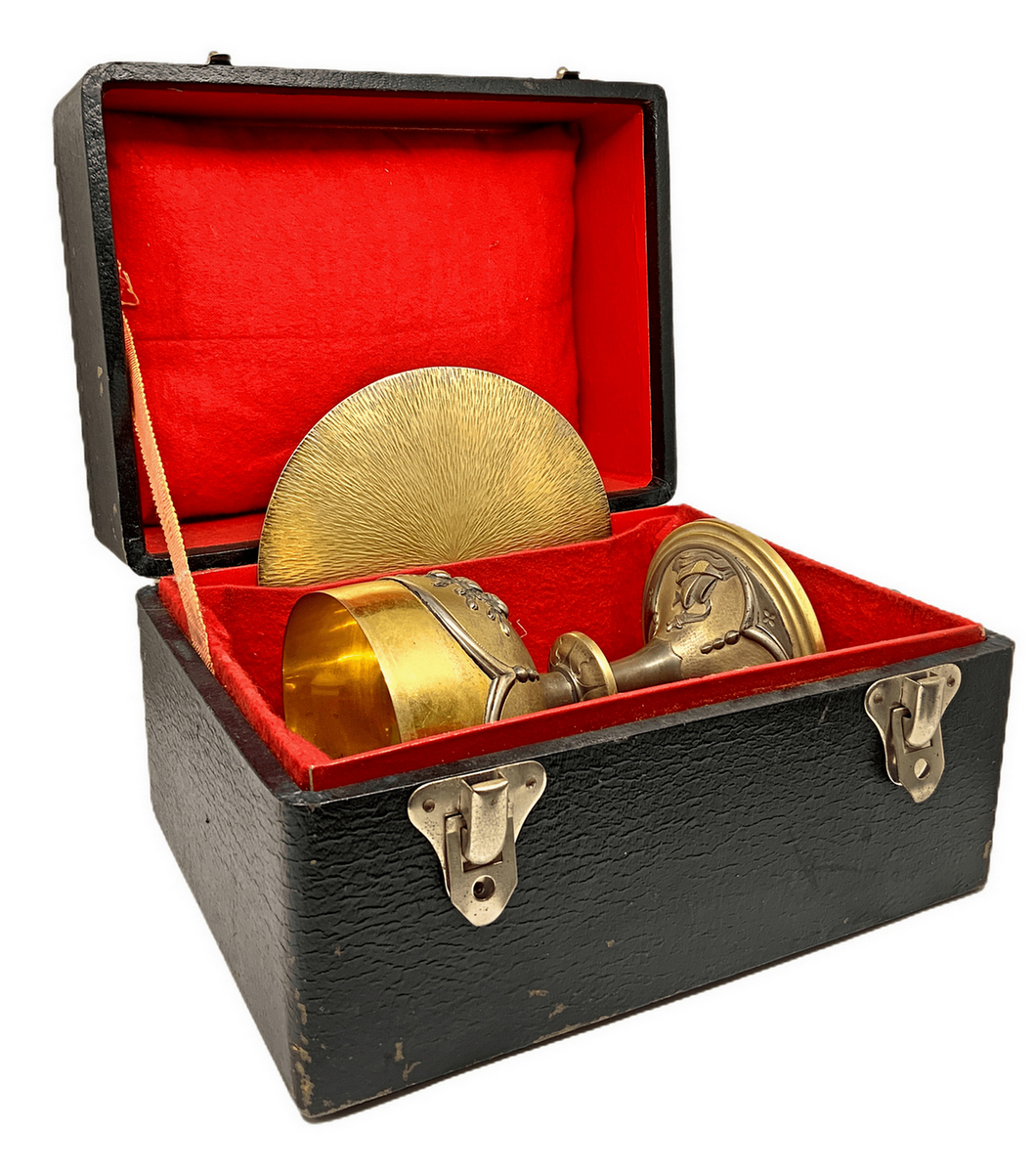 Calice con patena in argento vermeil decorato a sbalzo con motivi floreali, primi XX secoli. Sulla base simboli religiosi. H cm 15 . Gr 490 . Con custodia originale.