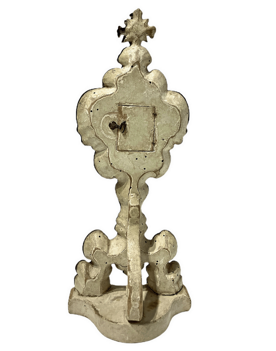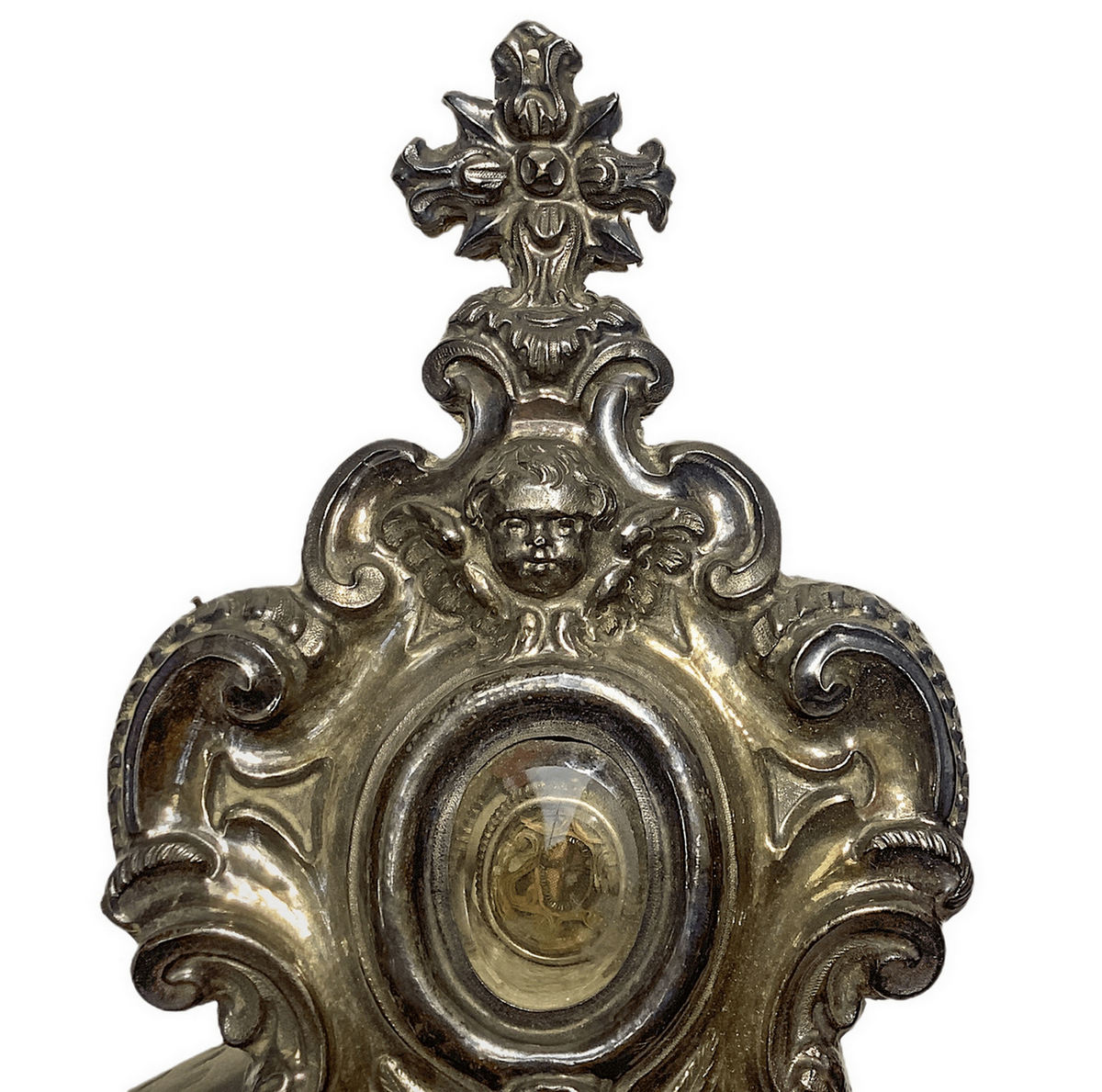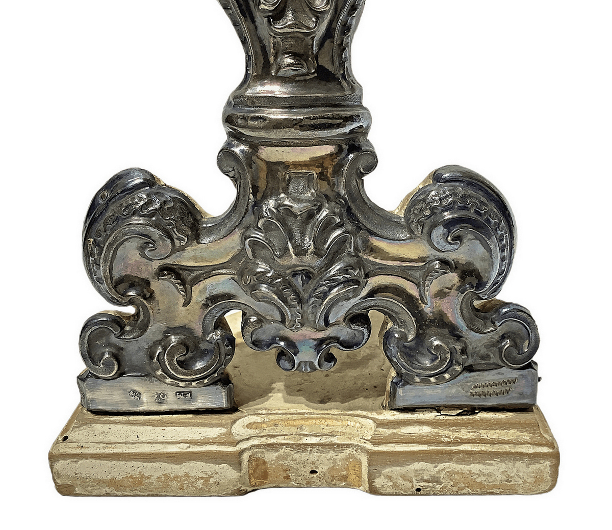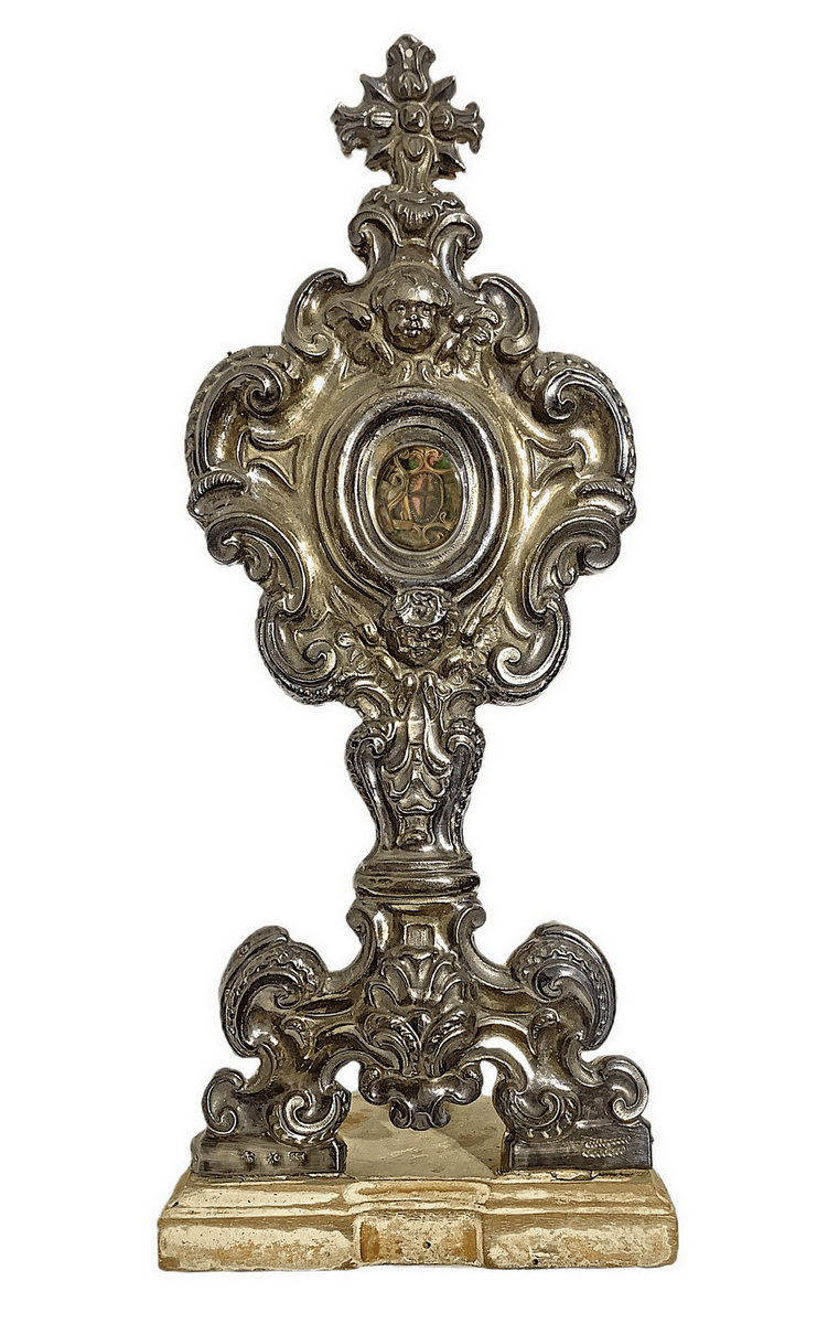 Reliquiario in argento, XVIII secolo su base lignea . Datato sulla base 1793. Iniziali F.M. H cm 37