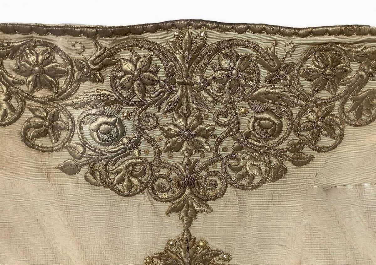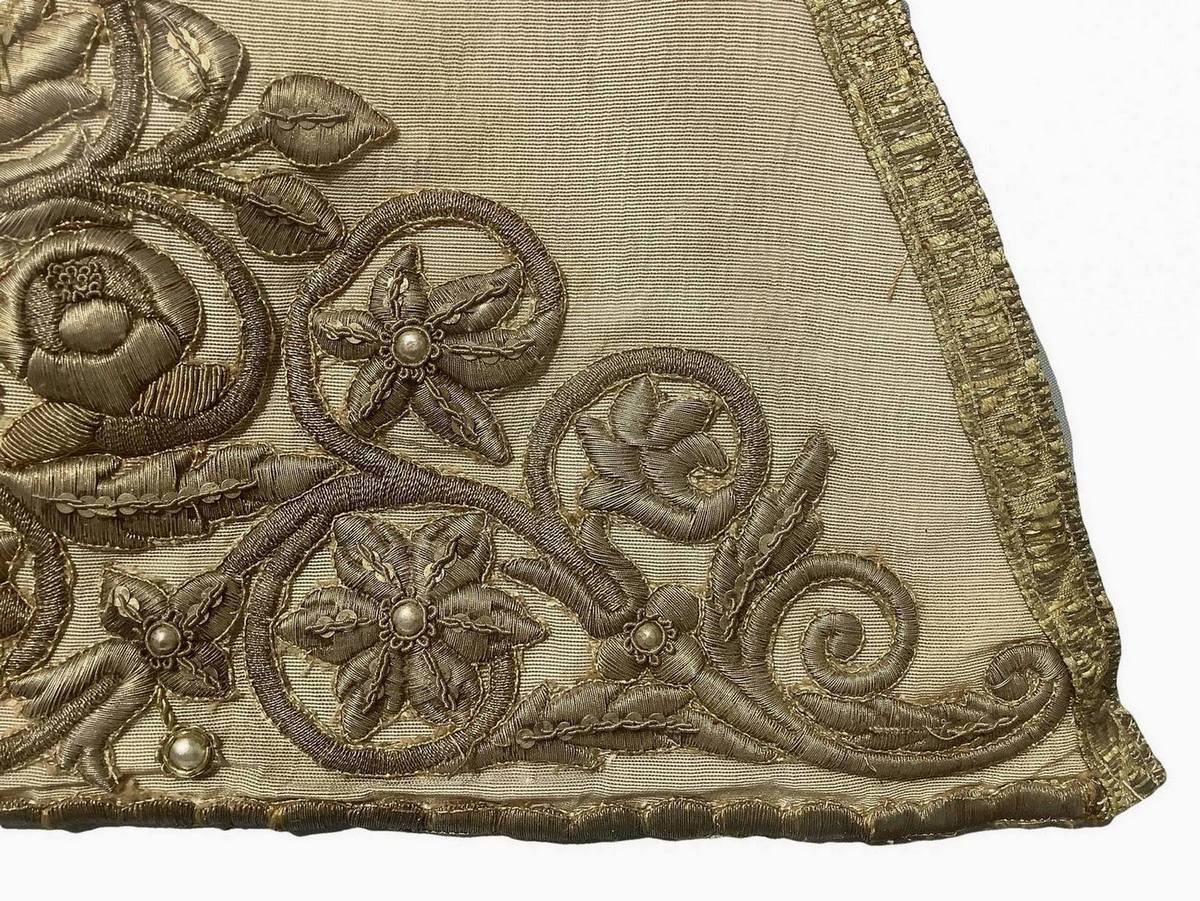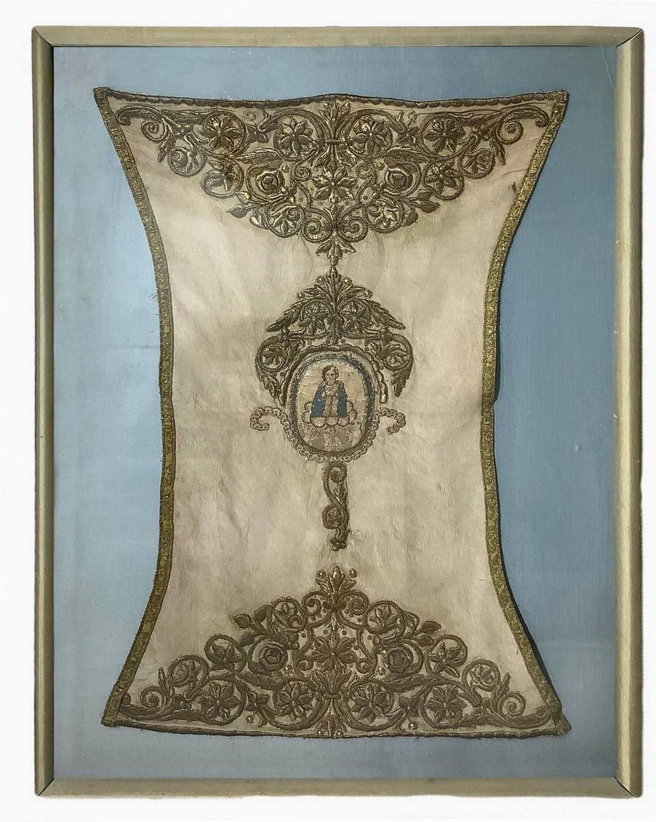 Paramento sacro con decorazioni in oro zecchino ed effige della Madonna, XVII secolo. Cm 76x48, in cornice cm 80x62
