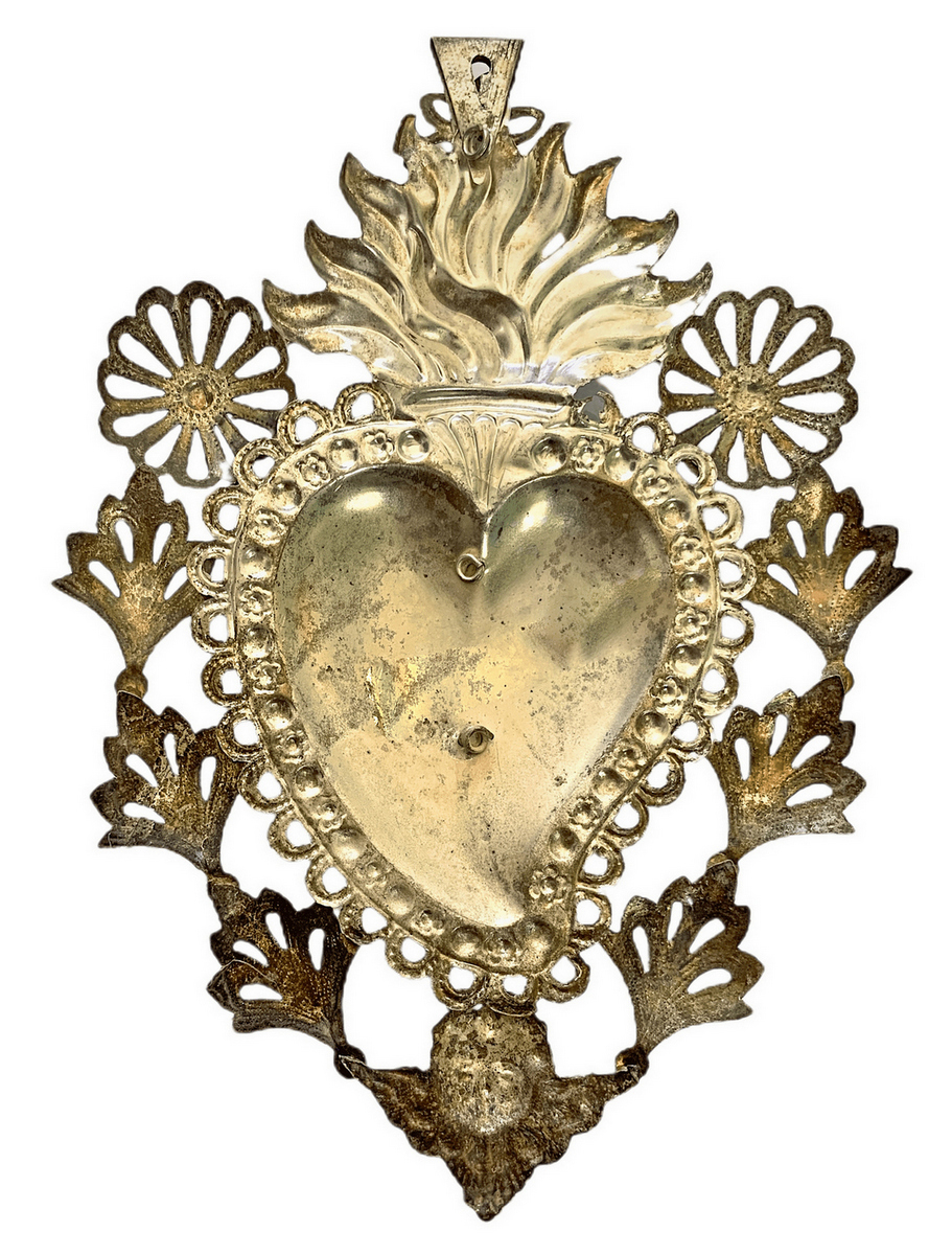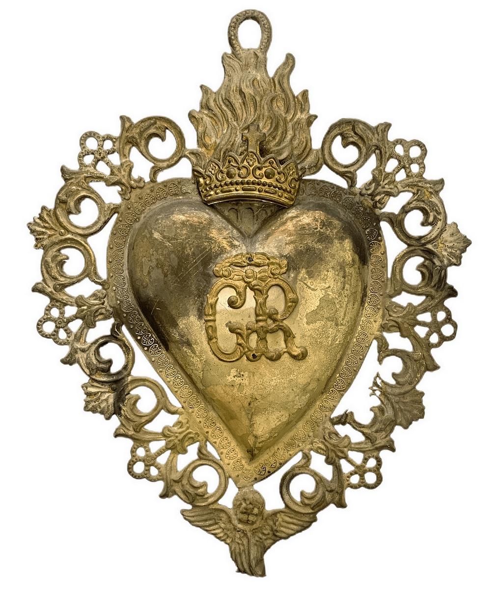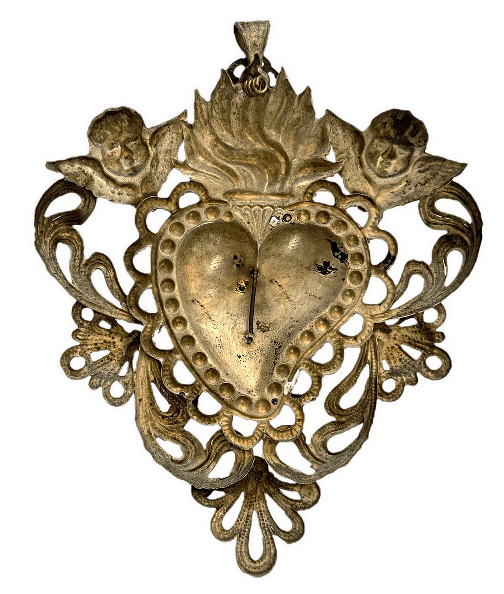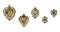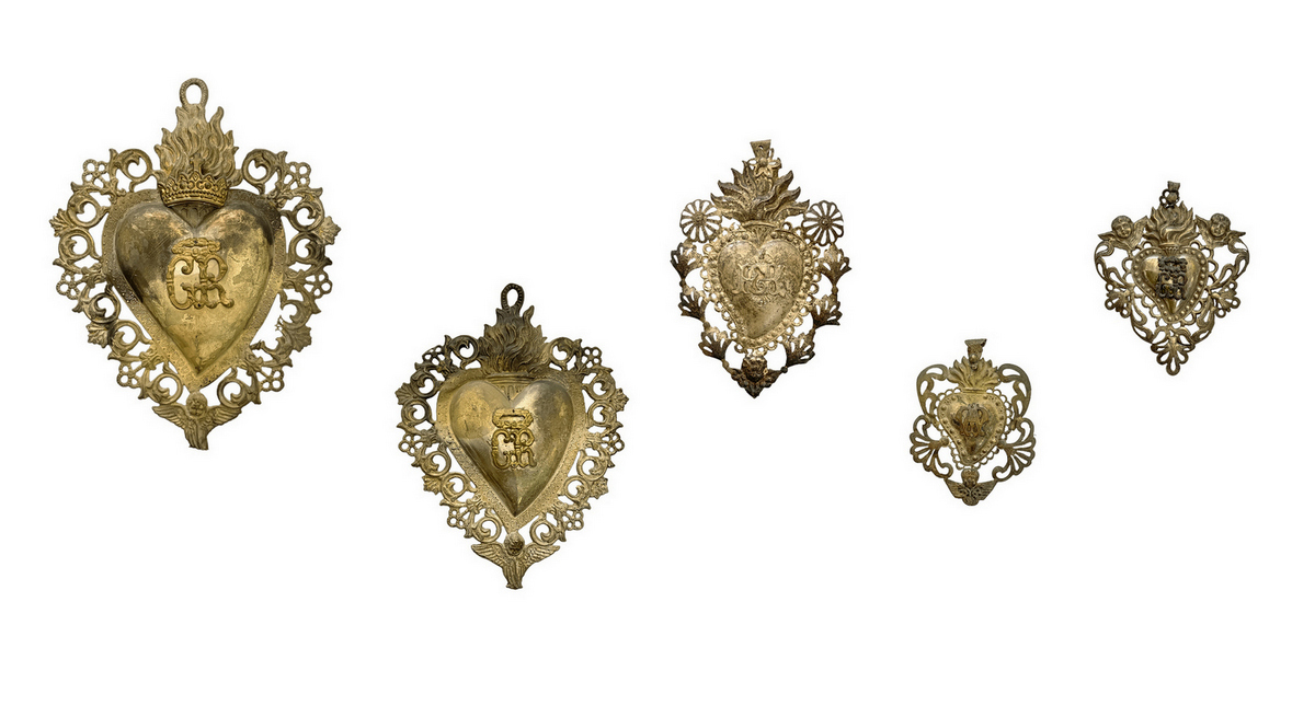 N 5 Ex voto in argento in parte a vermeil a forma di cuore con puttini e zefiri. 1) H cm 14,5; 2) H cm 10,5; 3) H cm 9; 4) H cm 20; 5) H cm 17;
