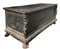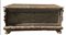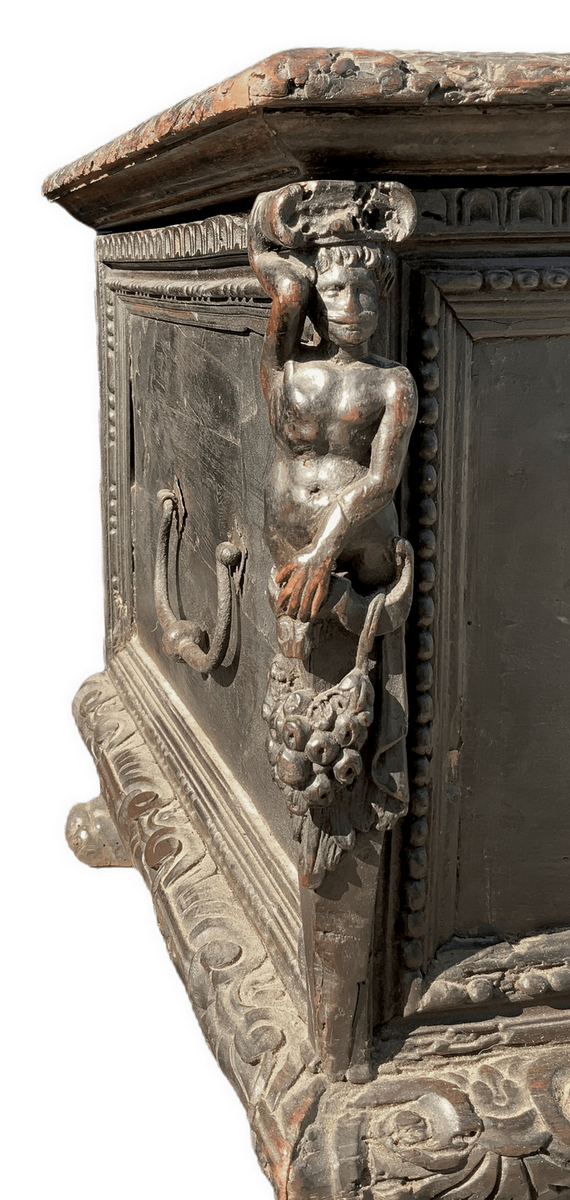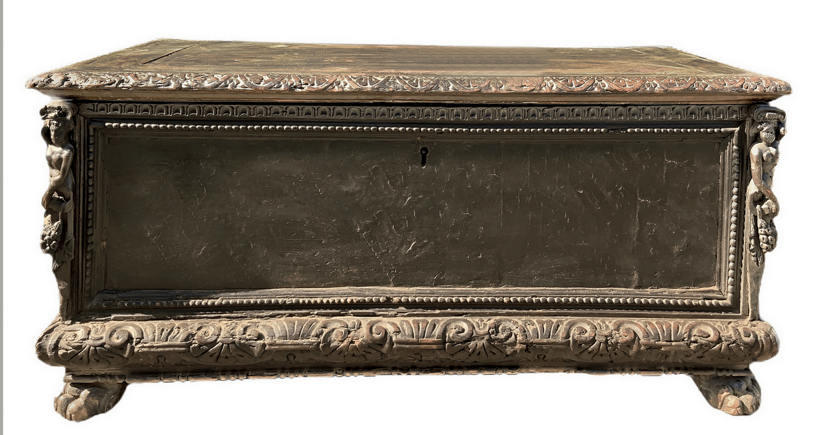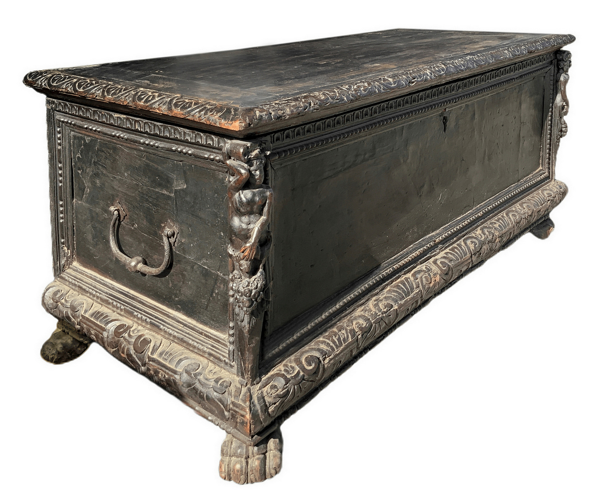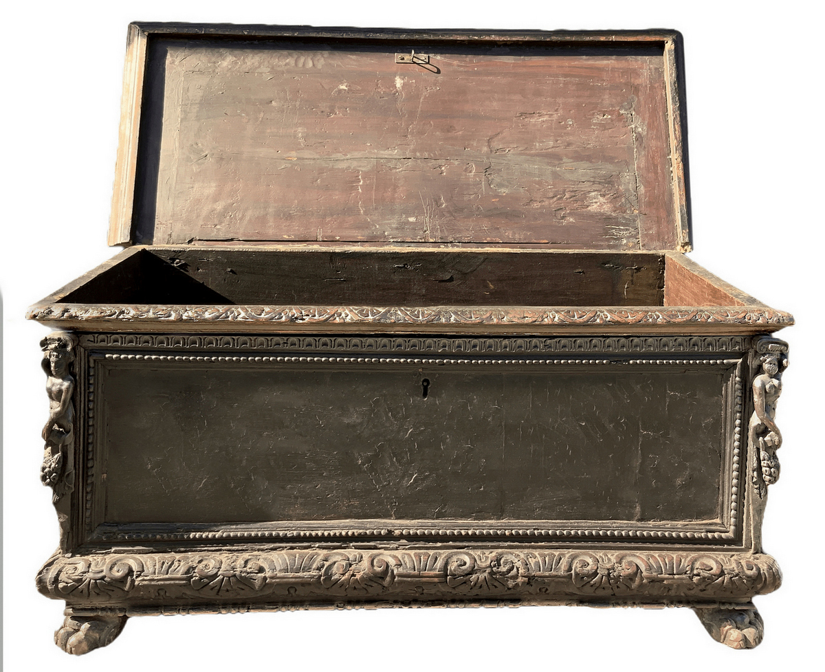 Cassapanca in legno di noce con sculture agli angoli raffiguranti cariatidi, cornice riccamente intagliata, piedi leonin