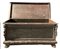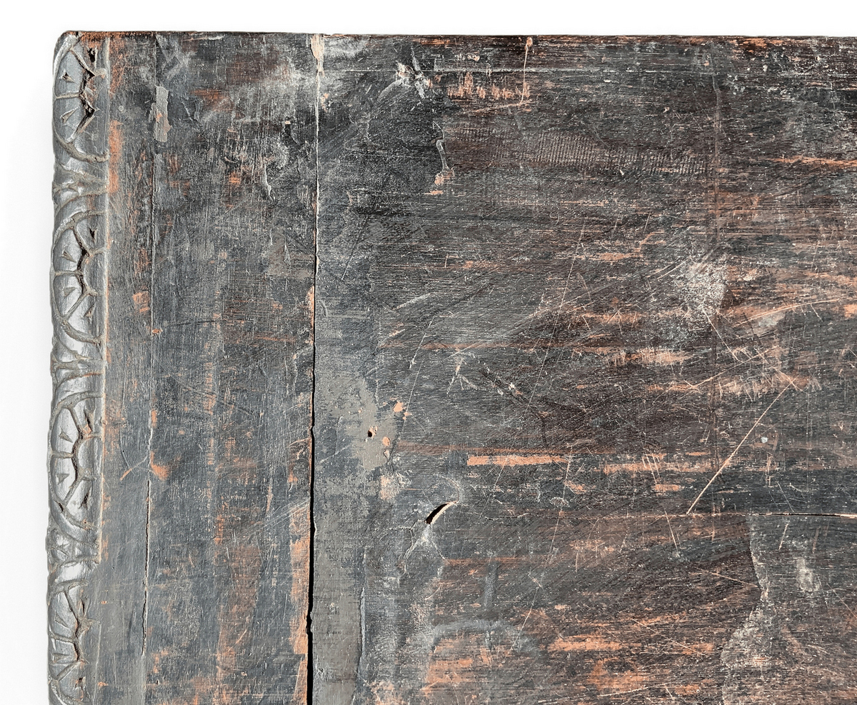 Cassapanca in legno di noce con sculture agli angoli raffiguranti cariatidi, cornice riccamente intagliata, piedi leonini e maniglie ai lati, fine XVII secolo. Altezza cm 50. Larghezza cm 110. Profondità cm 54