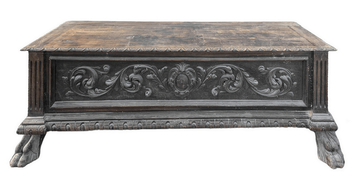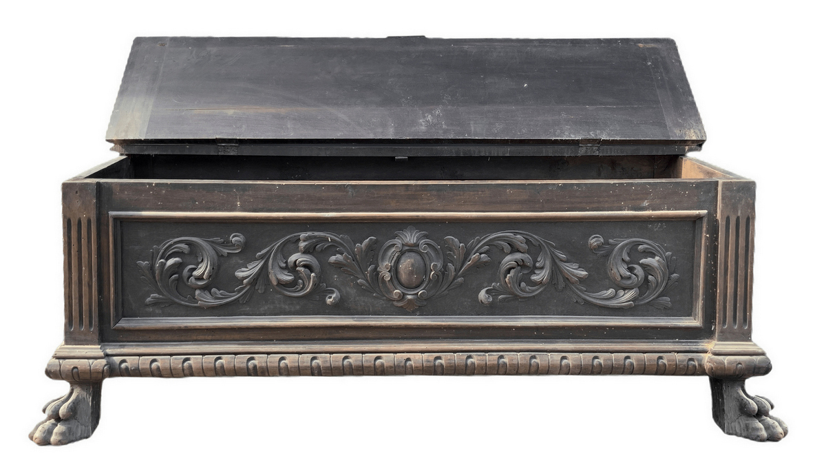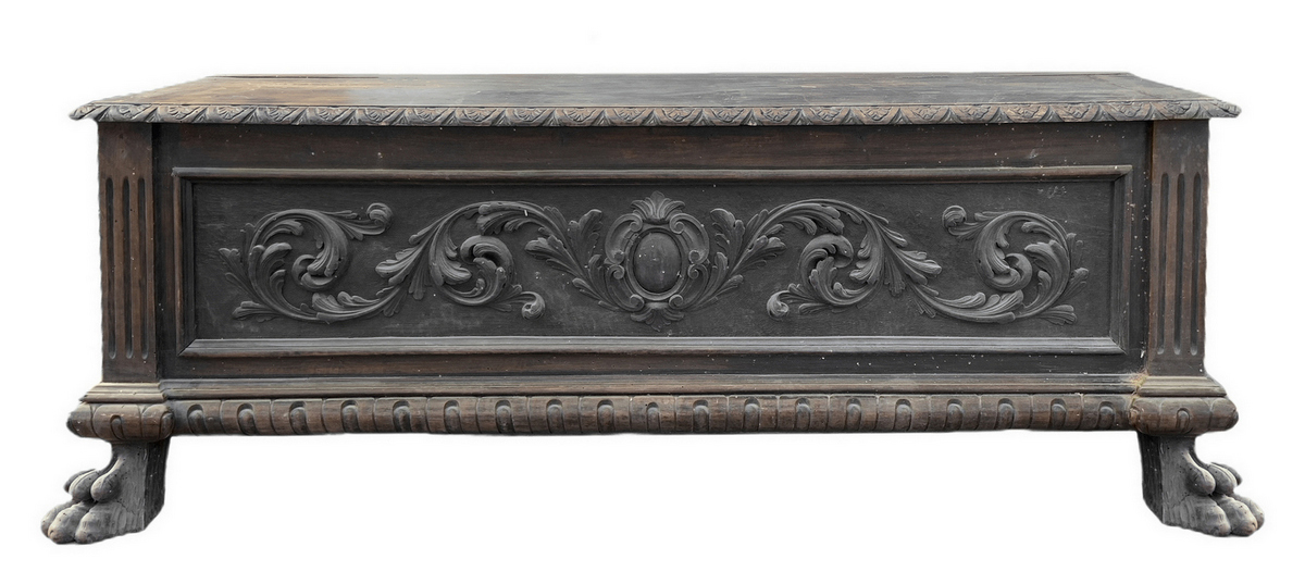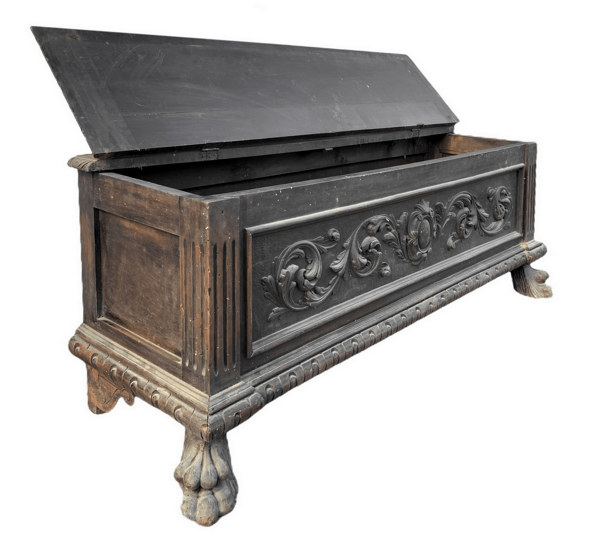 Cassapanca con intagli sul fronte a larghe foglie d'acanto, XIX secolo. H cm 54. Larghezza cm 105. Profondità cm 45