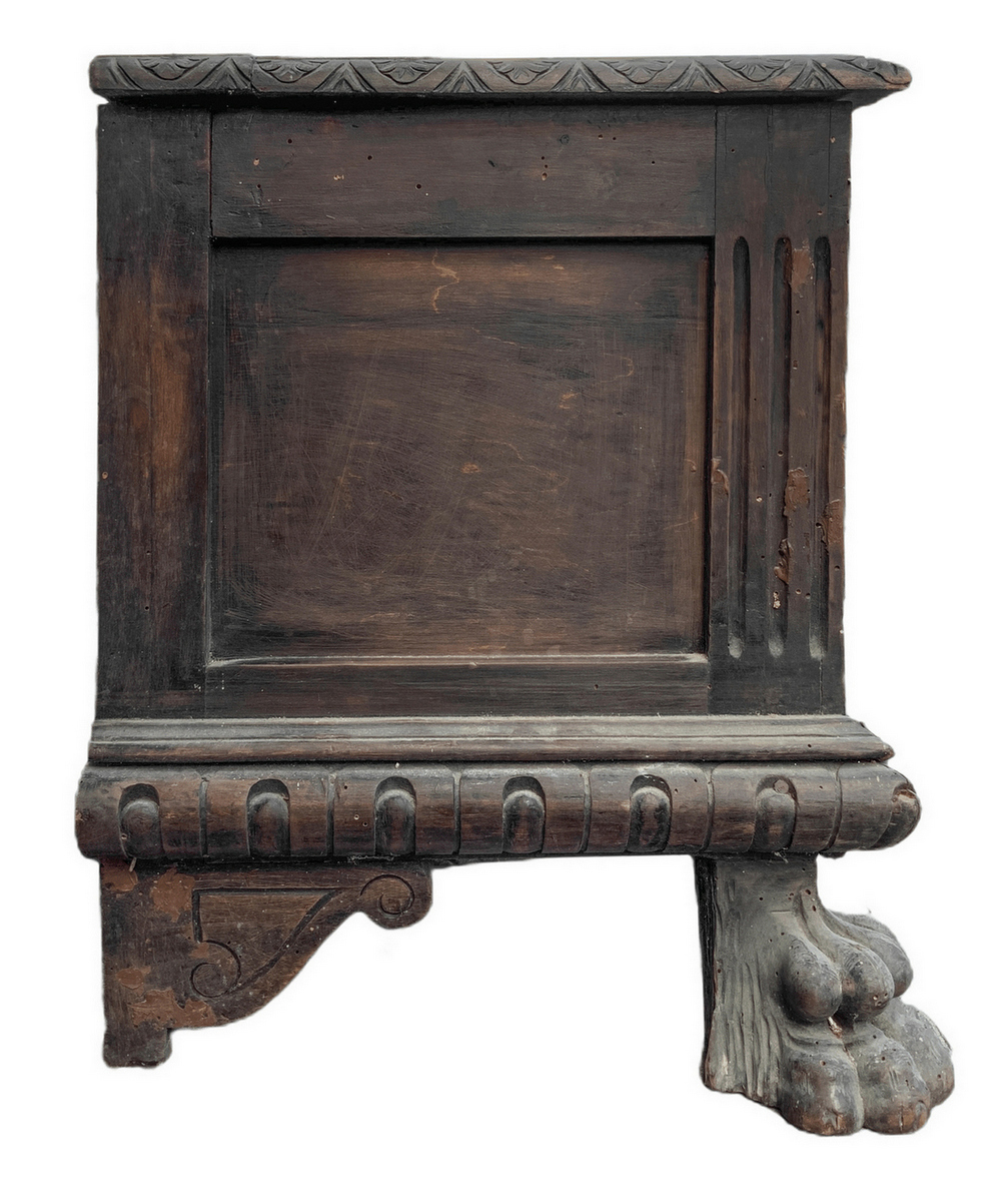 Cassapanca con intagli sul fronte a larghe foglie d'acanto, XIX secolo. H cm 54. Larghezza cm 105. Profondità cm 45. Presenti restauri.