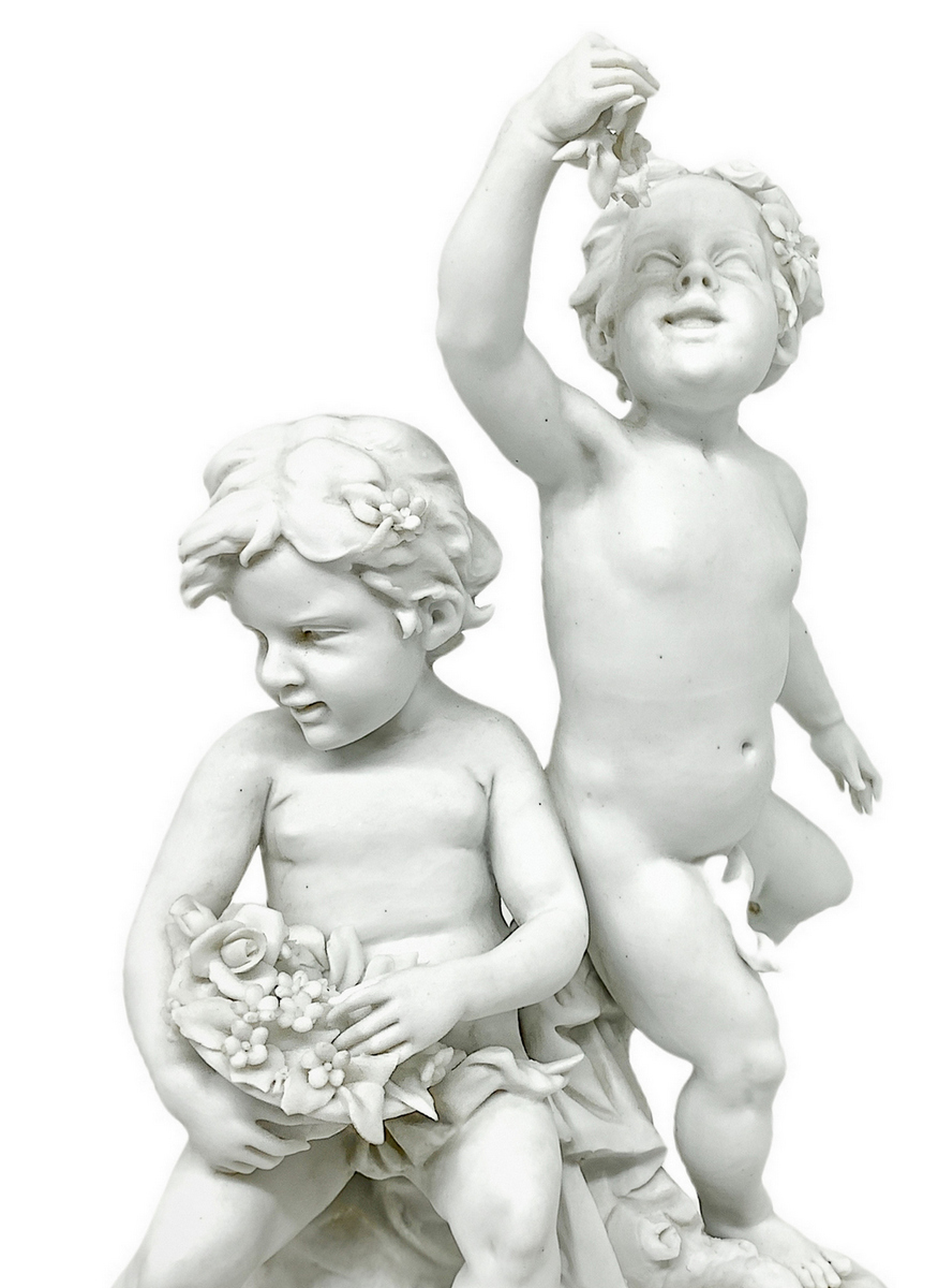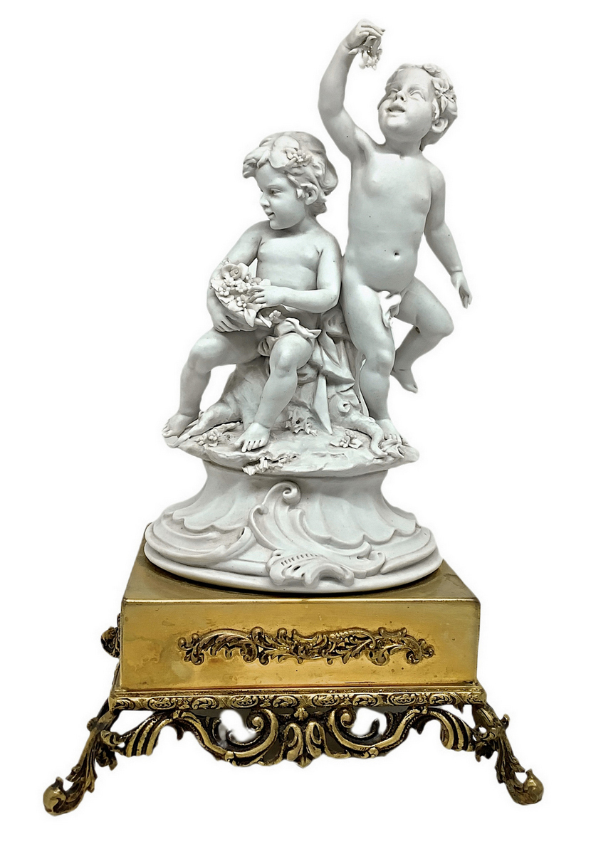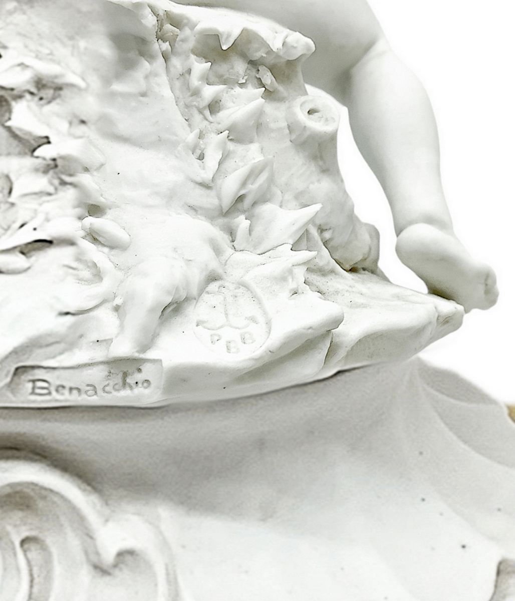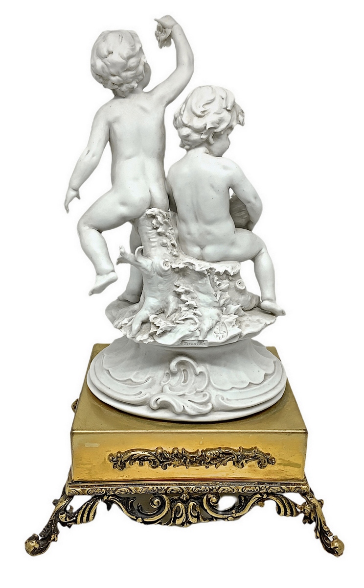 Porcellana in bisquit bianco raffigurante coppia di puttini e base in ottone dorato, XX secolo, firmato Benacchio. H cm 25. Base cm 15x13