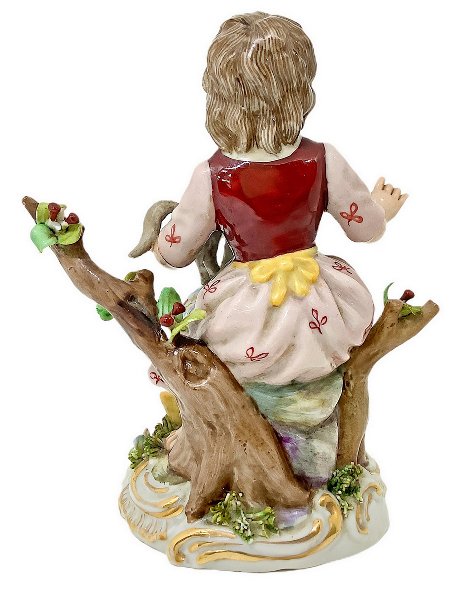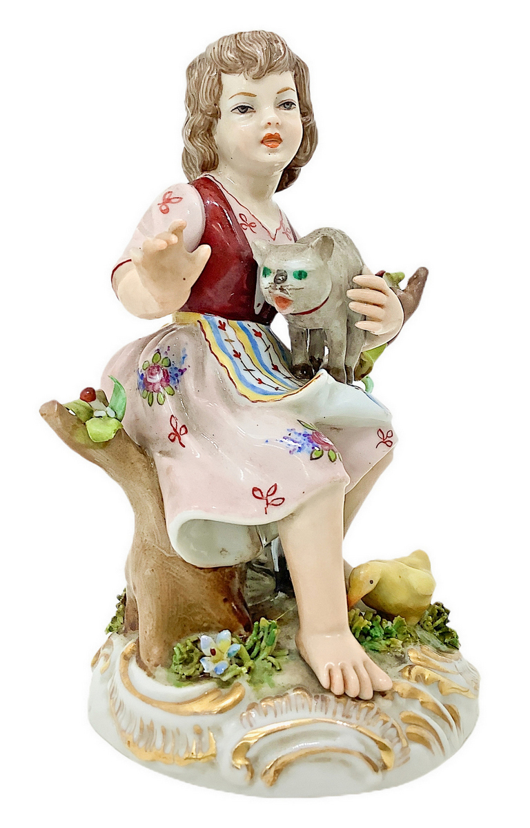 Statuina inporcellana di Capodimonte raffigurante bambina con gatto. Inizi ‘900. H cm 13. Base cm 7