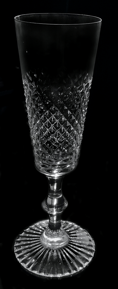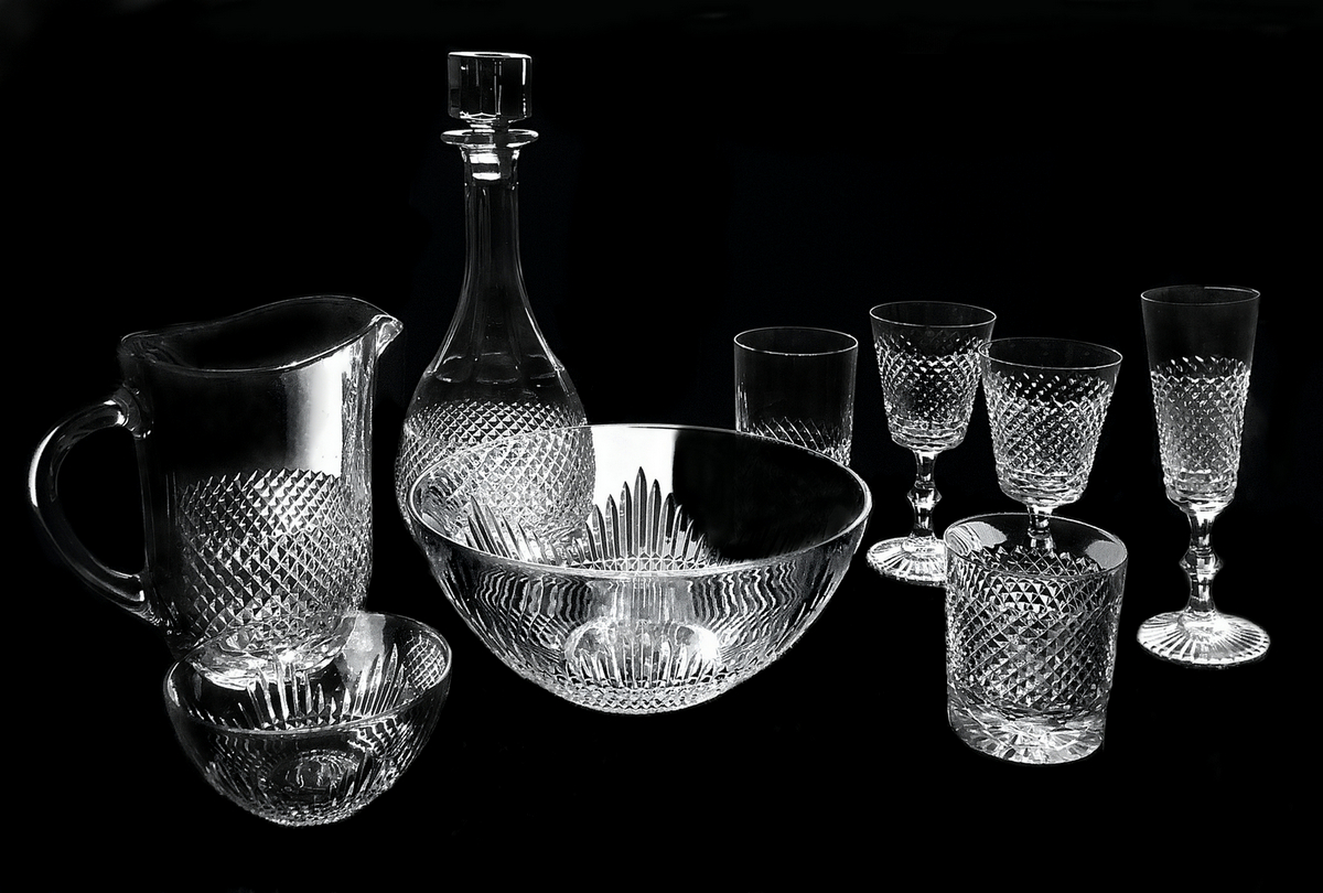 Servizio di bicchieri di cristallo, Cristalleria Persichino, servizio “Ascotâ€, composto da: 12 bicchieri vino, 12 bicchieri acqua, 12 bicchieri champagne, 12 bicchieri whisky, 6 bicchieri cognac, 1 bottiglia, 1 brocca.