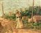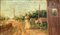 Dipinto ad olio su tavola raffigurante strada di campagna con dama. XIX , XX secolo. Cm 11x18. In cornice dorata cm 19x26.