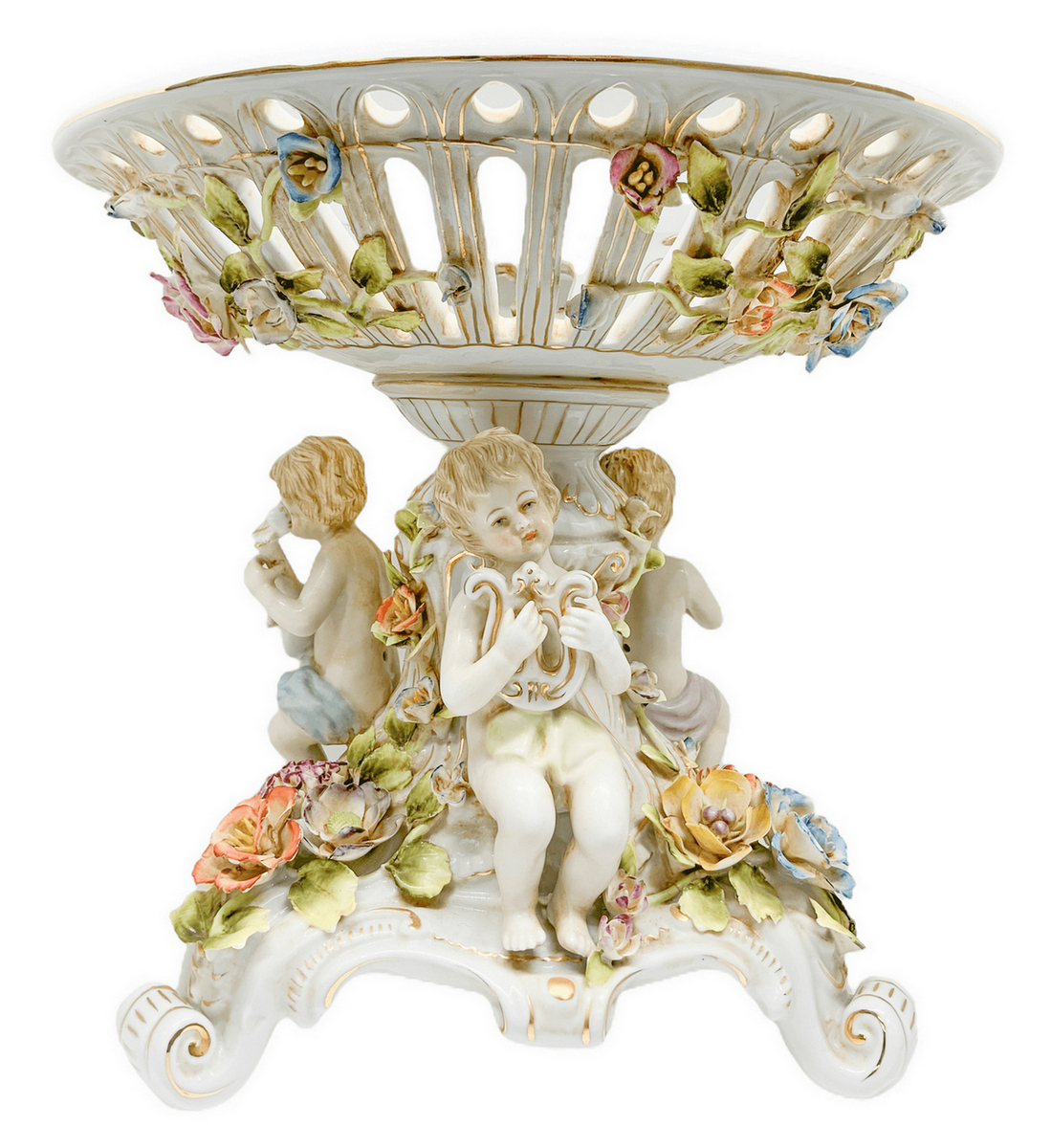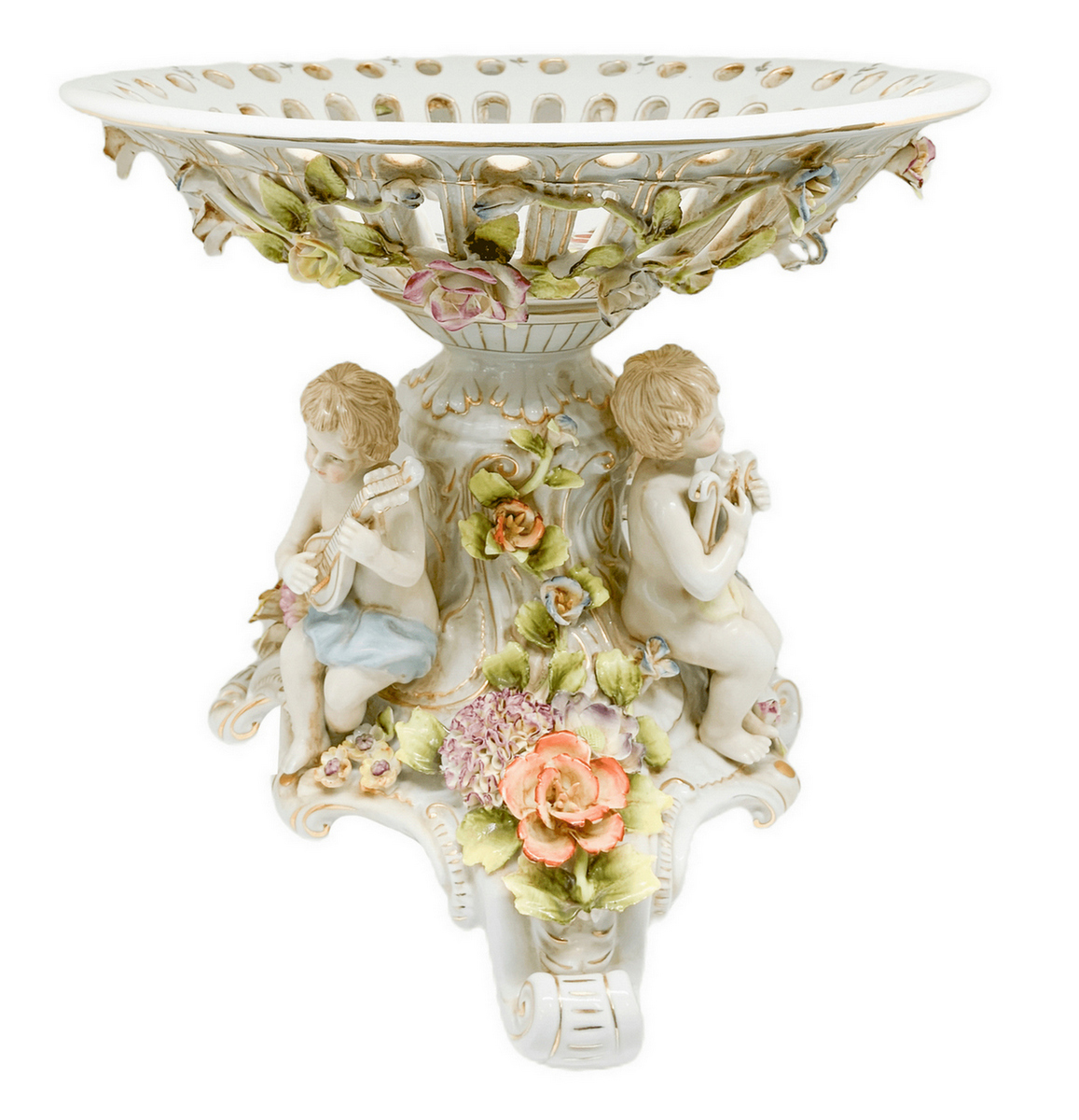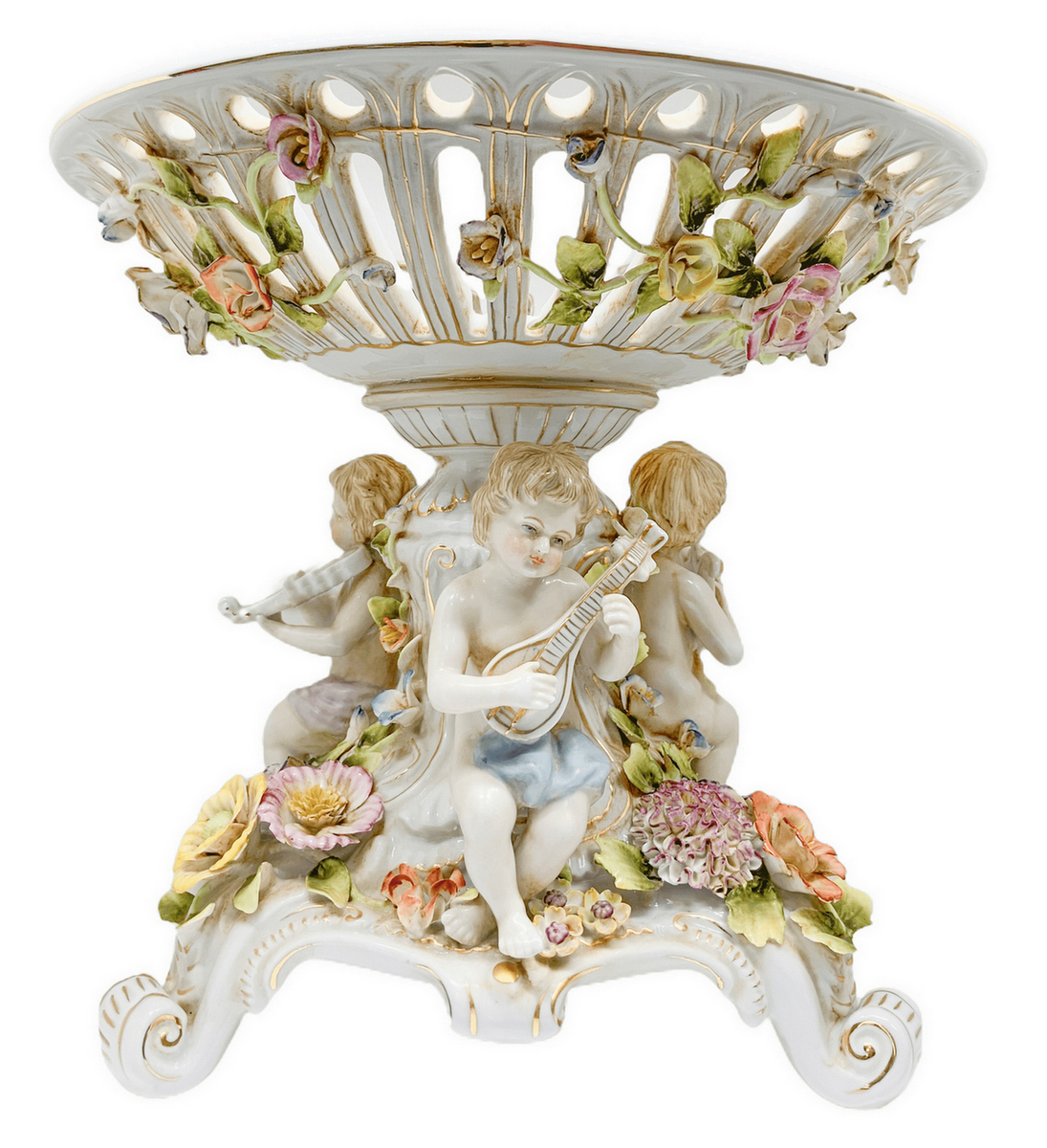 Centrotavola marcato Meissen, alla base putti musicanti. XX secolo. H cm 28