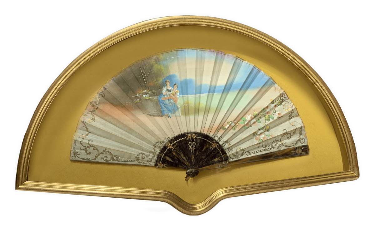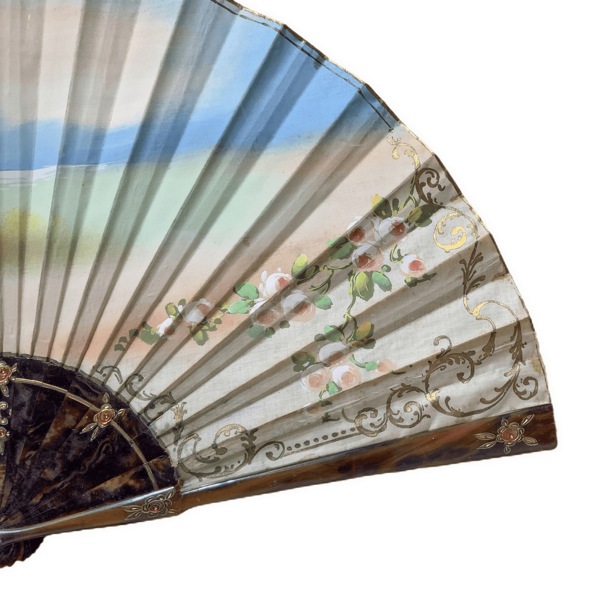 Ventaglio con stecche in tartaruga dipinto a mano con figure femminili. Inizi XX secolo. Cm 43x72