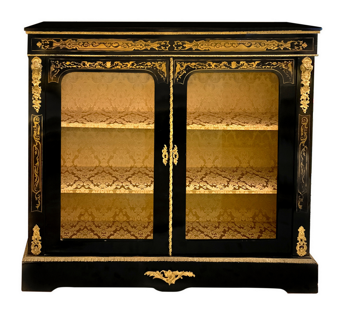 Vetrina bassa in legno nero ebanizzato e intarsi in ottone dorato e bronzi applicati, due sportelli a vetri, interno con due mensole. Napoleone III, fine XIX secolo. H cm 115. Cm 120x33