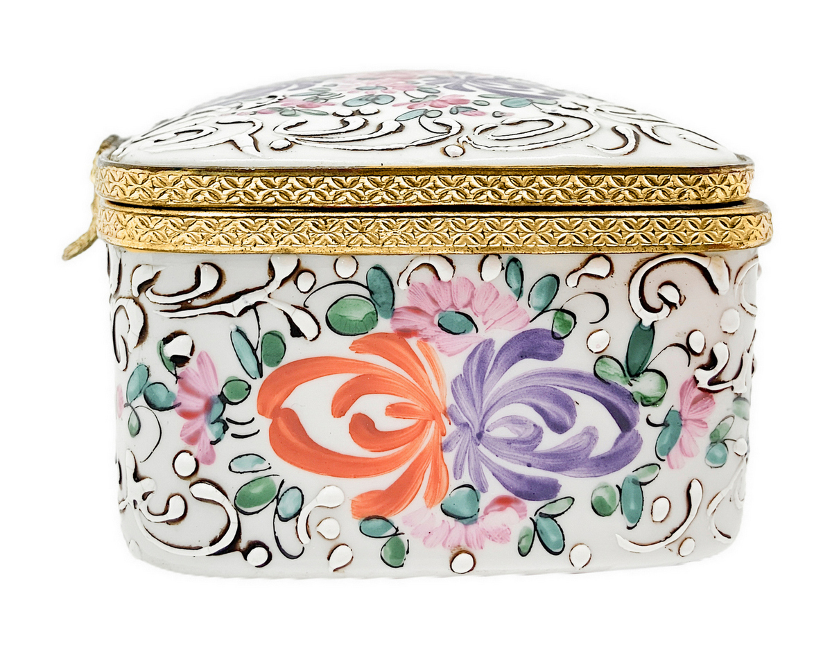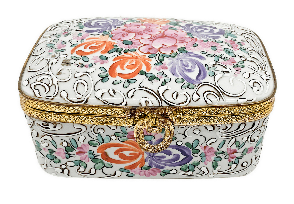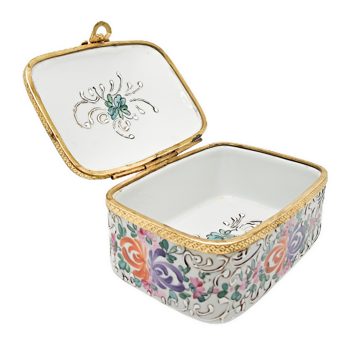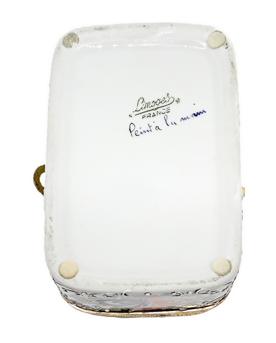 Lot 157 | Piccola tabacchiera Limoges con decori floreali, XX secolo. H cm 4,5, cm 10x8