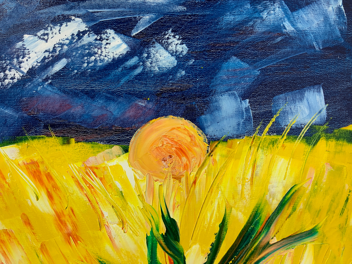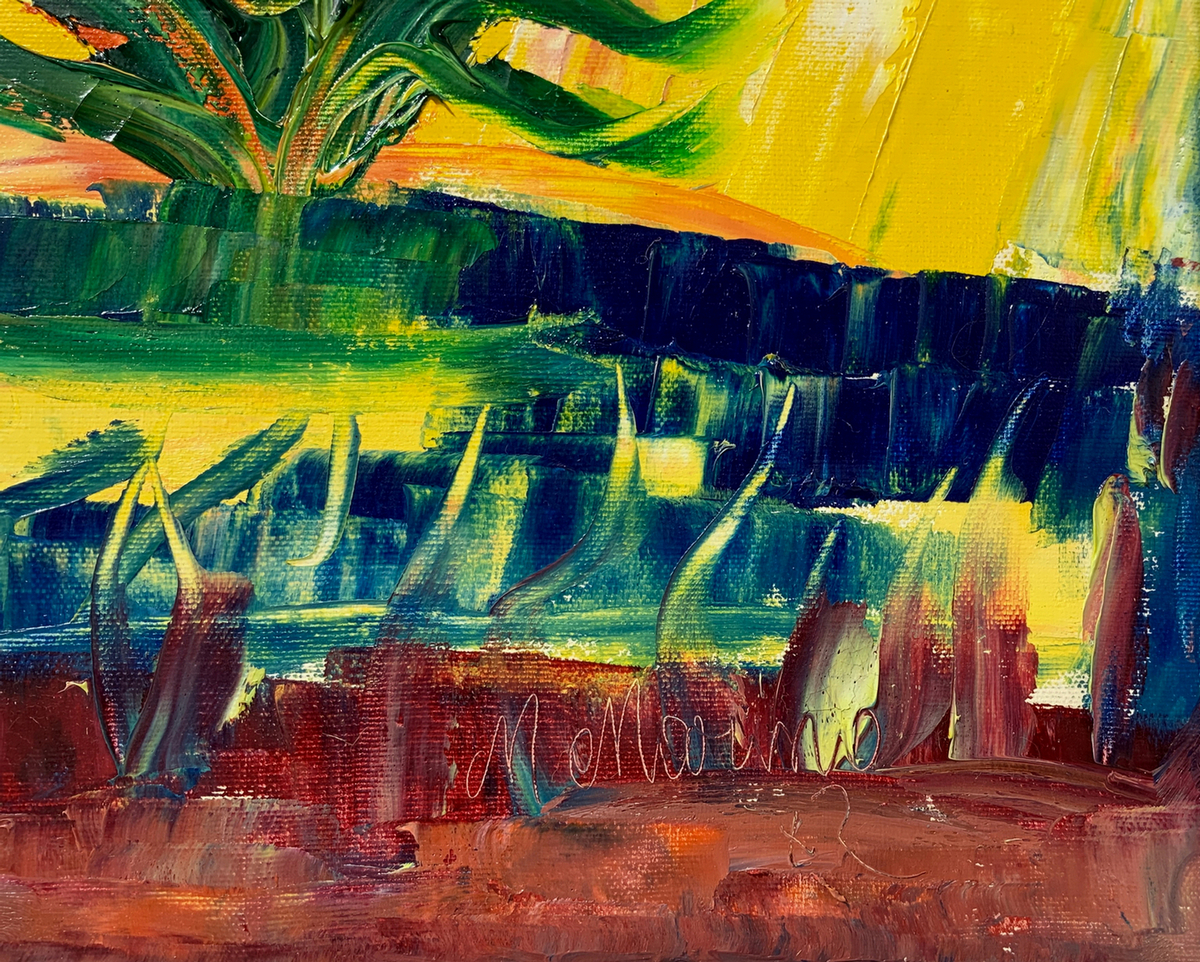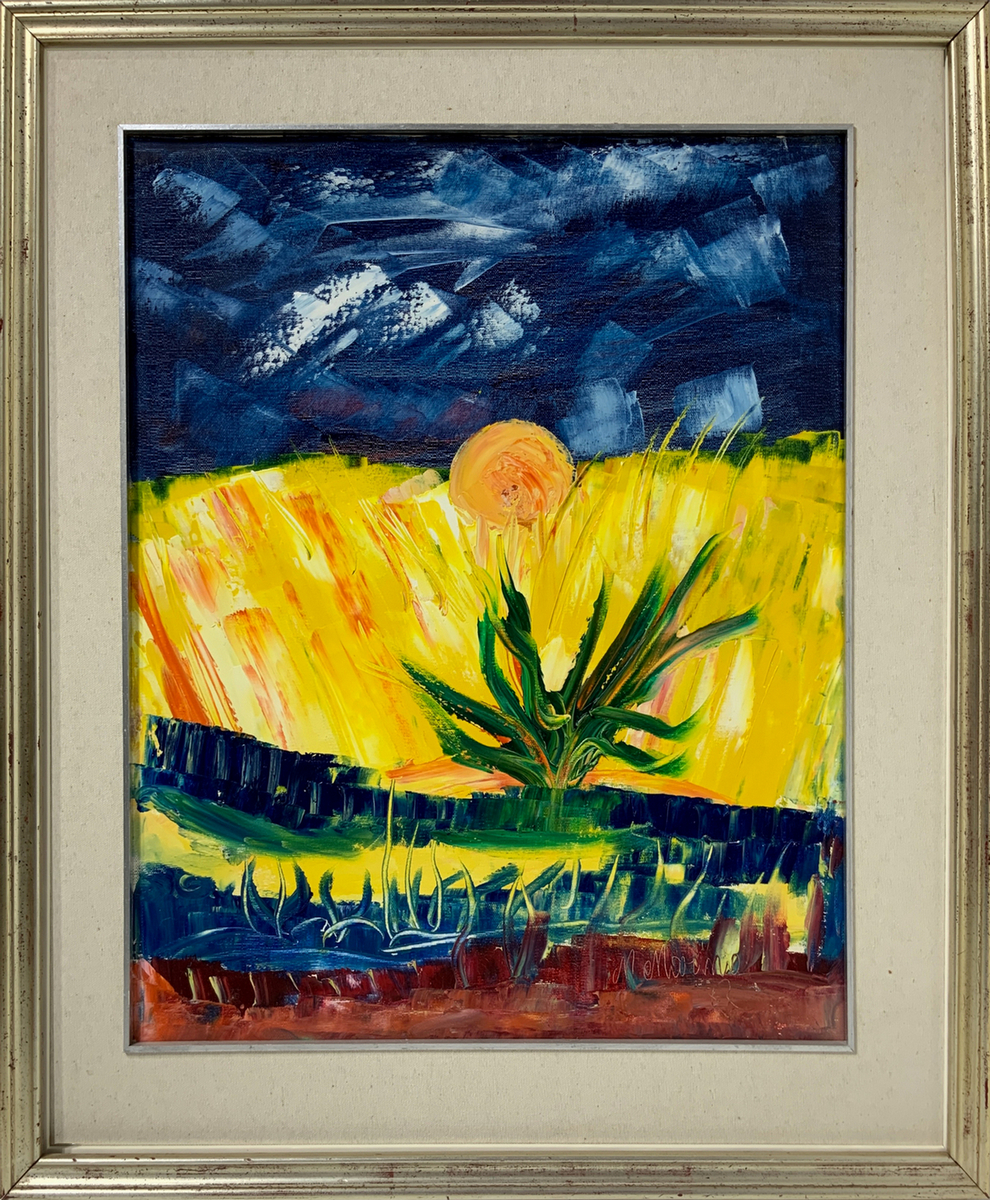 Dipinto ad olio su tela firmato M. Marino, raffigurante agave e campo di grano. Cm 60x50