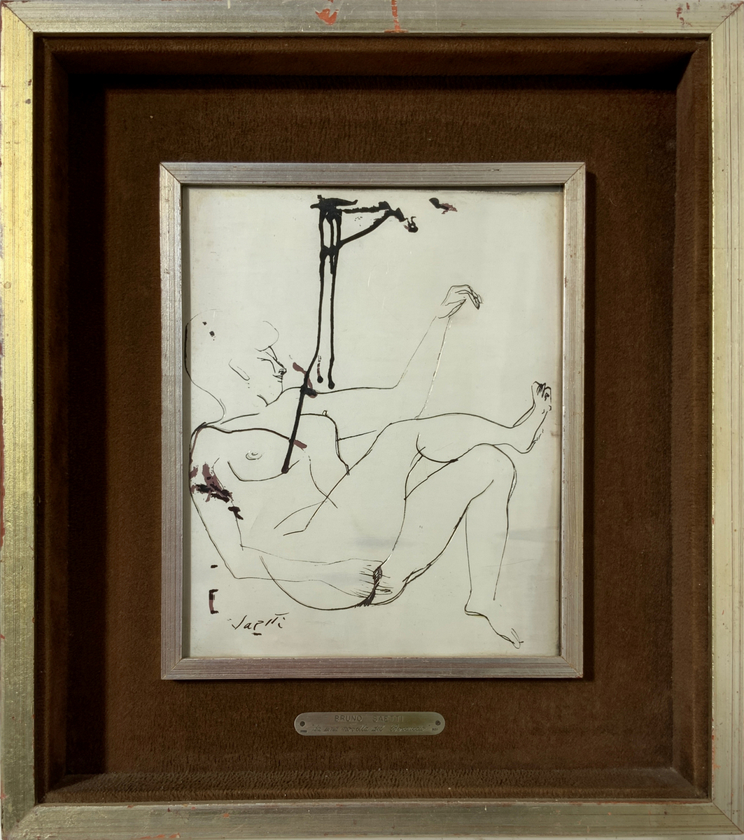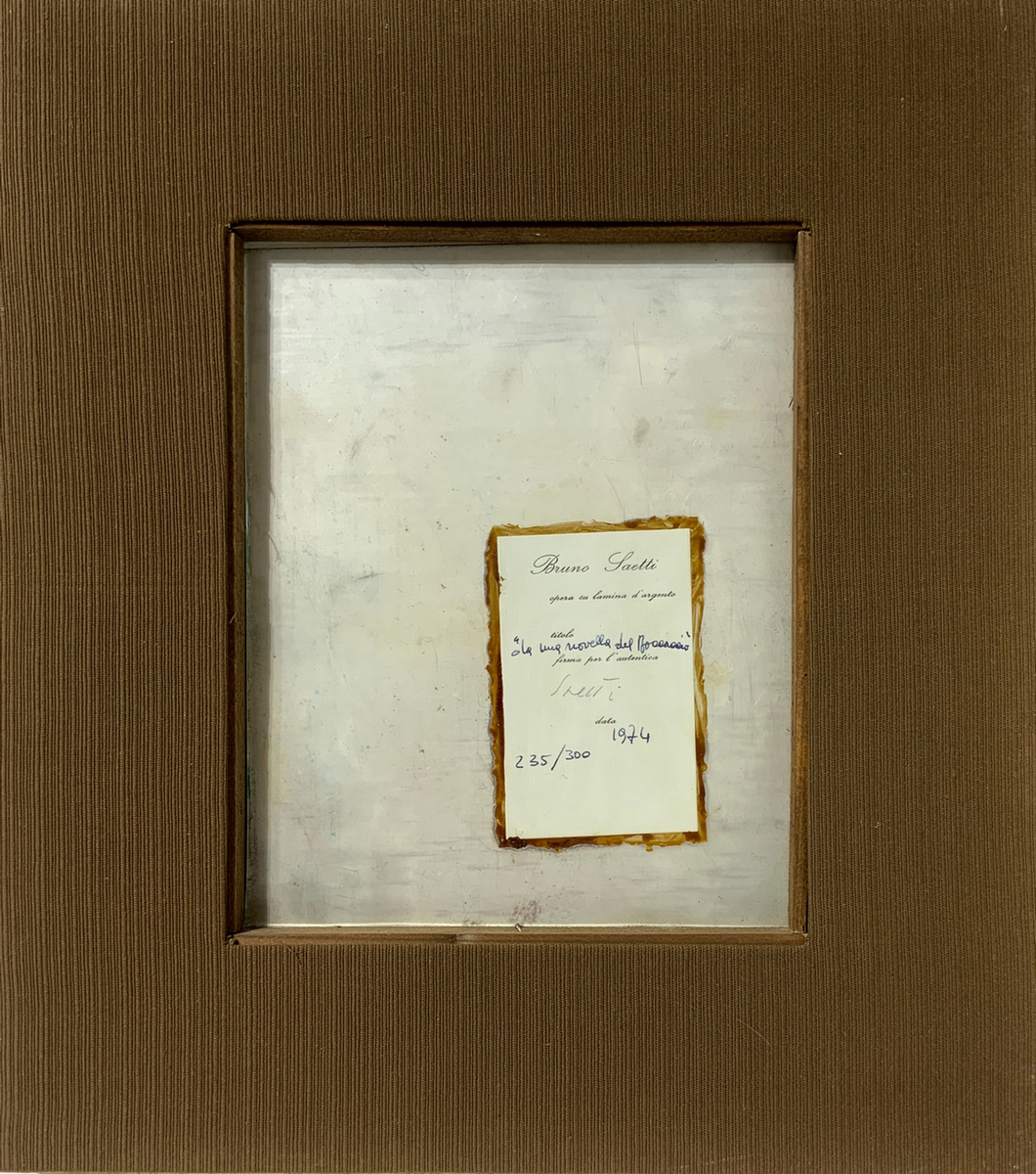 Litografia su lamina d’argento, Bruno Saetti (1902-1984), raffigurante “Da una Novella del Boccaccioâ€(1974). N 235/300. Cm 26x21, in cornice 41x36