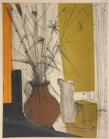 Nunzio Sciavarrello (Bronte, 1918 - Catania, 2013), Litografia raffigurante natura morta di vasi. Firmata in basso a sin