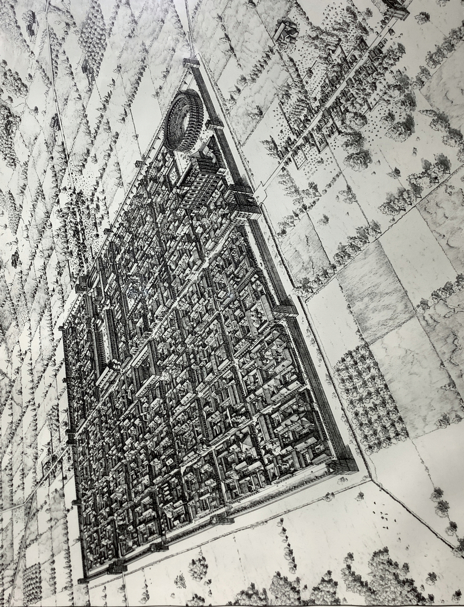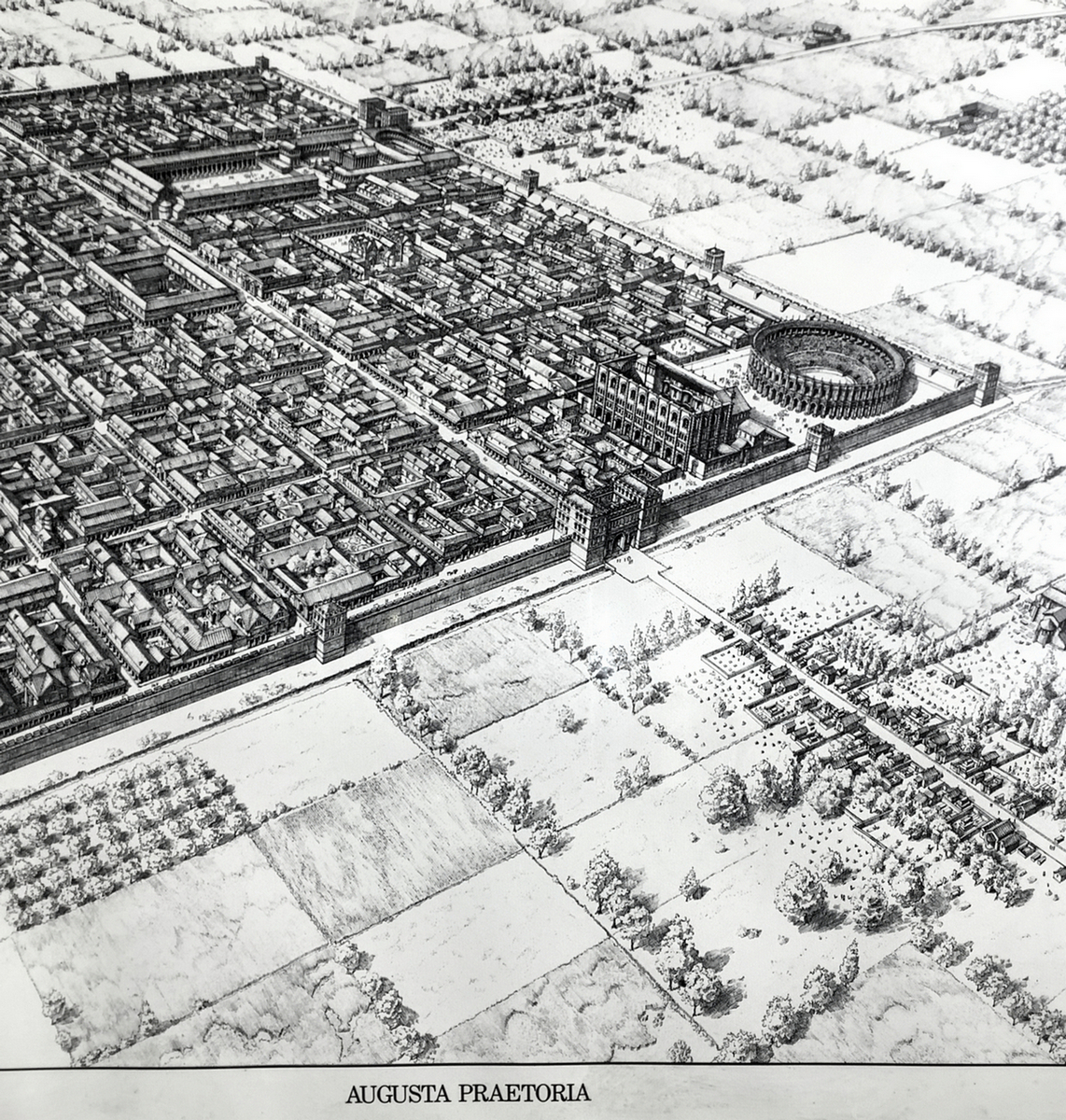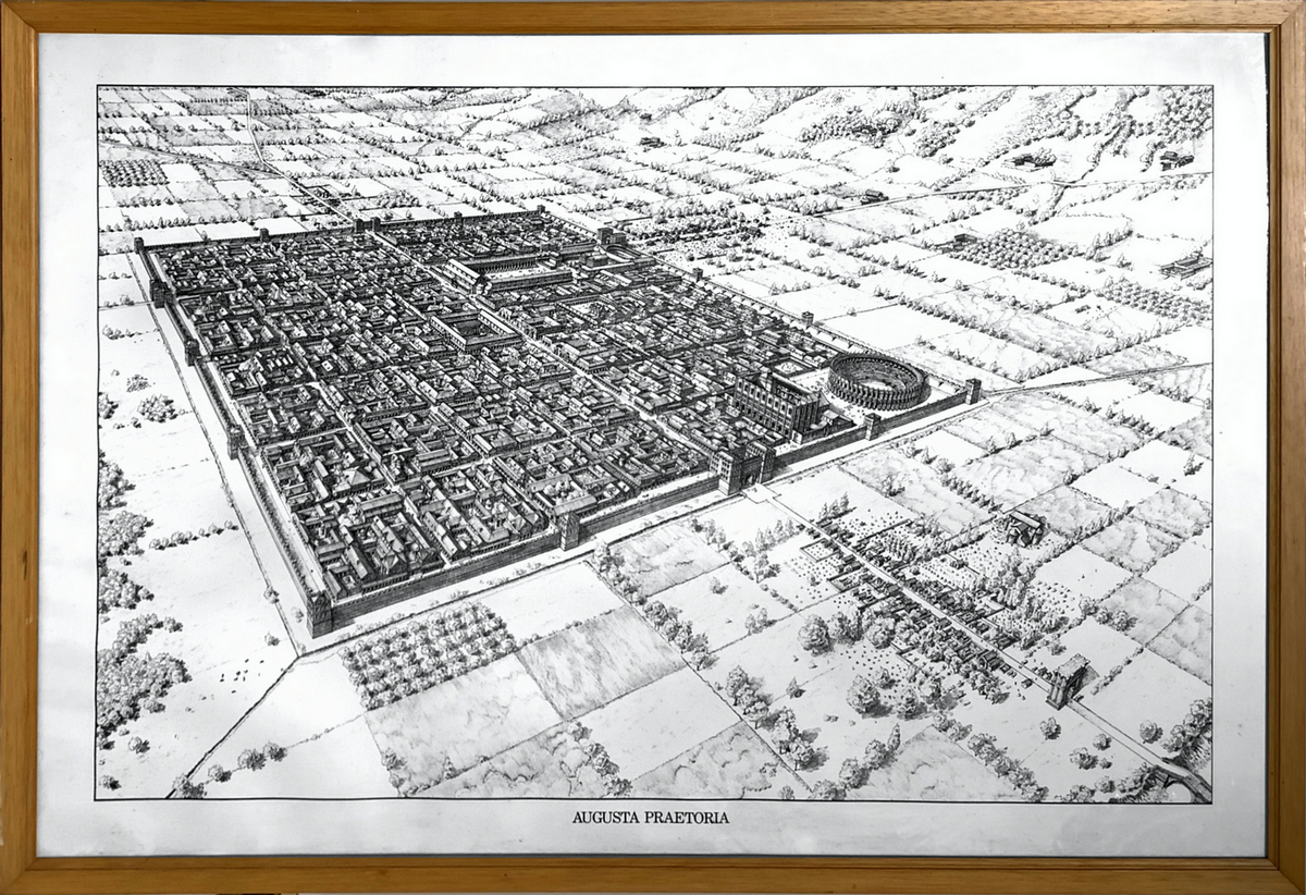 Stampa Augusta Praetoria (Aosta)su disegno di Franceso Corni (Modena 1952-Strambino 2020). Cm 74x105