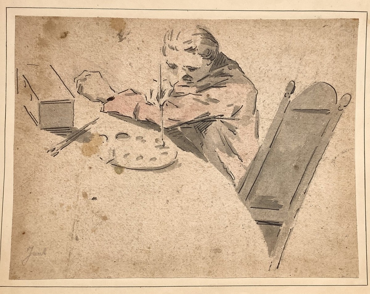 Disegno ad inchiostro nero acquerellato raffigurante autoritratto, firmato in basso a destra Juul de Cort 1918-1999. 165